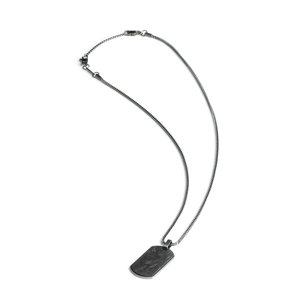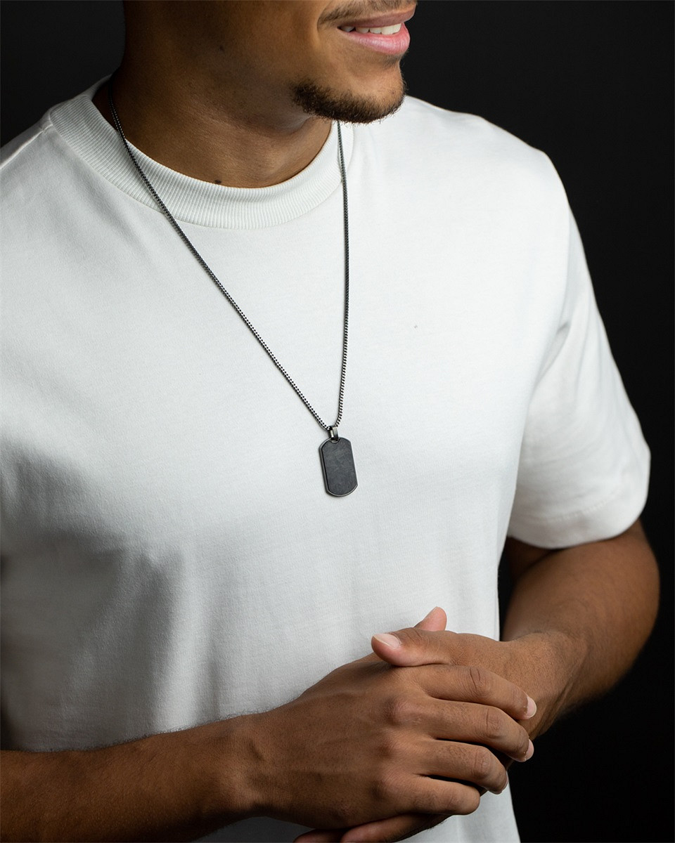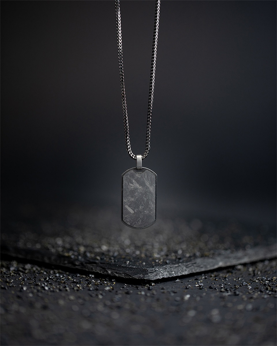 Diese Halskette in Bellum Black besteht aus einer 2 mm langen dunkelfarbigen Fuchsschwanzkette und hält einen Anhänger mit geschmiedeter Kohlefaser. Der lateinische Name „Bellum“ bedeutet „Krieg“ und bezieht sich auf die Form der Halskette, die oft von modernen Soldaten getragen wird.