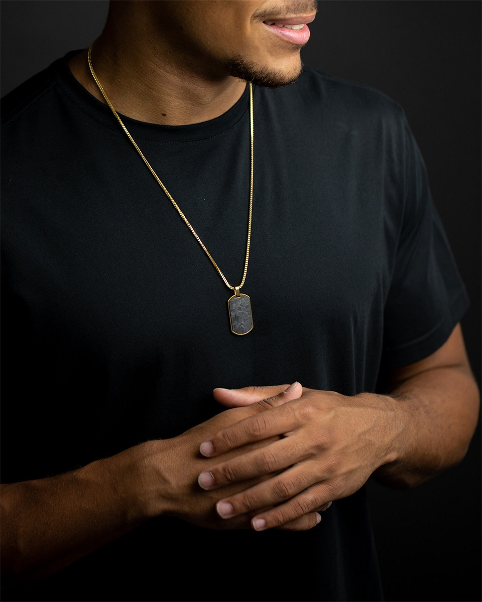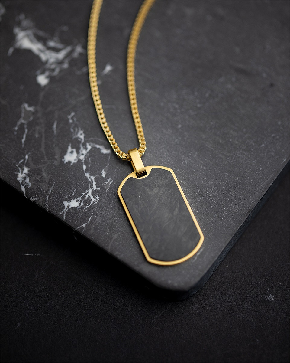 Diese Bellum Gold-Halskette besteht aus einer 2 mm langen goldfarbenen Fuchsschwanzkette und hält einen Anhänger mit geschmiedeter Karbonfaser. Der lateinische Name „Bellum“ bedeutet „Krieg“ und bezieht sich auf die Form der Halskette, die oft von modernen Soldaten getragen wird.
