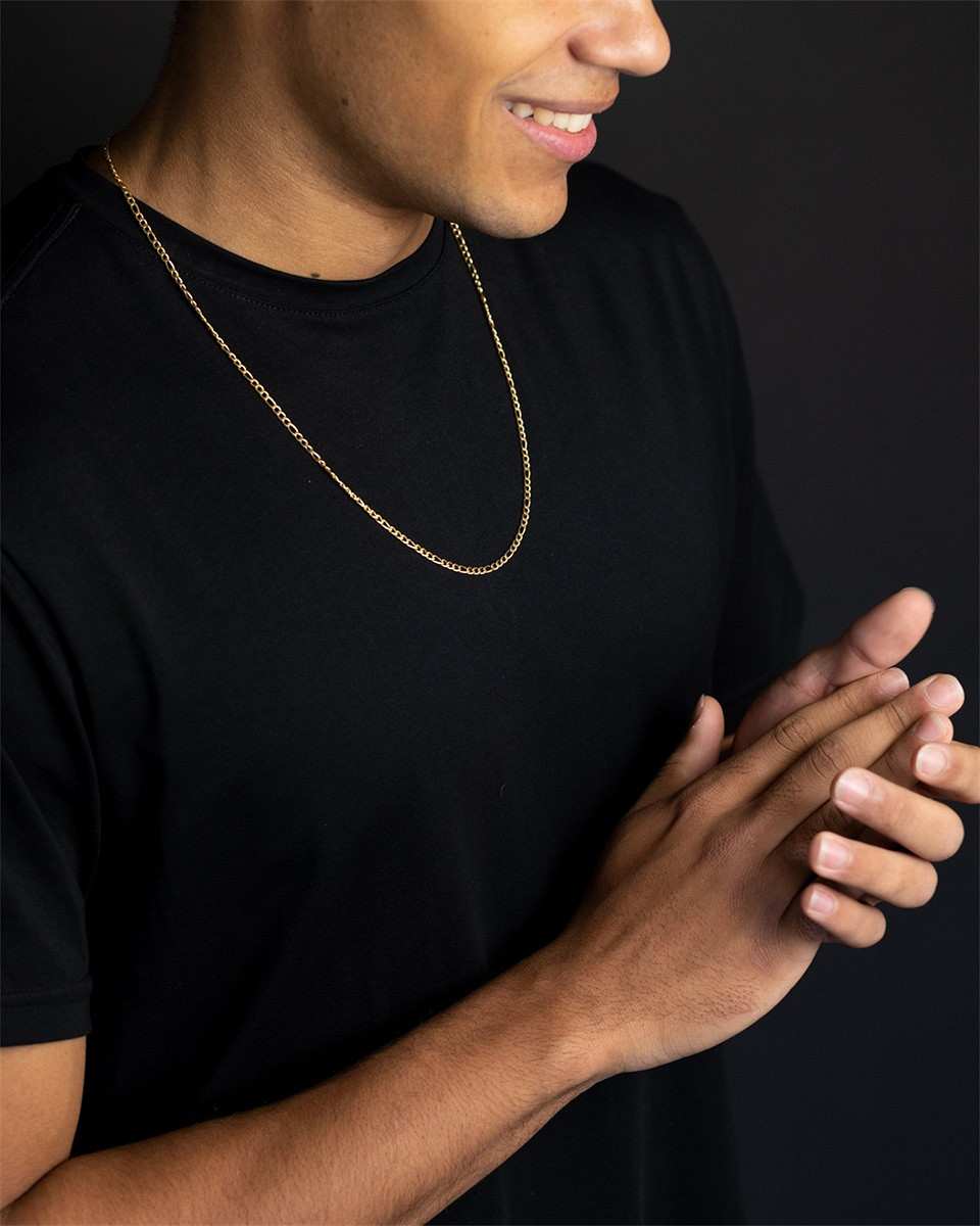 Die Primo Gold Halskette ist eine 3 mm lange Figarokette mit vergoldeter Oberfläche. Es besteht aus Edelstahl 316L und ist sehr leicht und langlebig. Sie können diese Kette bedenkenlos Tag für Tag tragen. Die Länge der Kette ist 54 cm lang und hat eine 10 cm lange Verlängerungskette, die Sie bei Bedarf hinzufügen können.