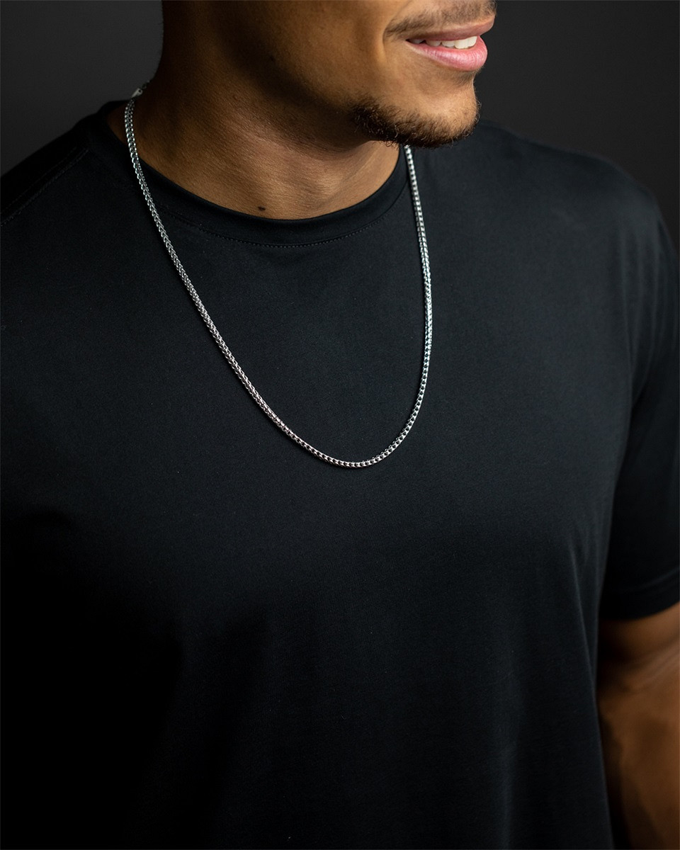Die Dux Silver Halskette ist eine 3 mm Fuchsschwanzkette mit poliertem Silberfinish. Es besteht aus Edelstahl 316L und ist sehr leicht und langlebig. Sie können diese Kette bedenkenlos Tag für Tag tragen. Die Kette ist 54 cm lang und hat eine 10 cm lange Verlängerungskette, die Sie bei Bedarf hinzufügen können.