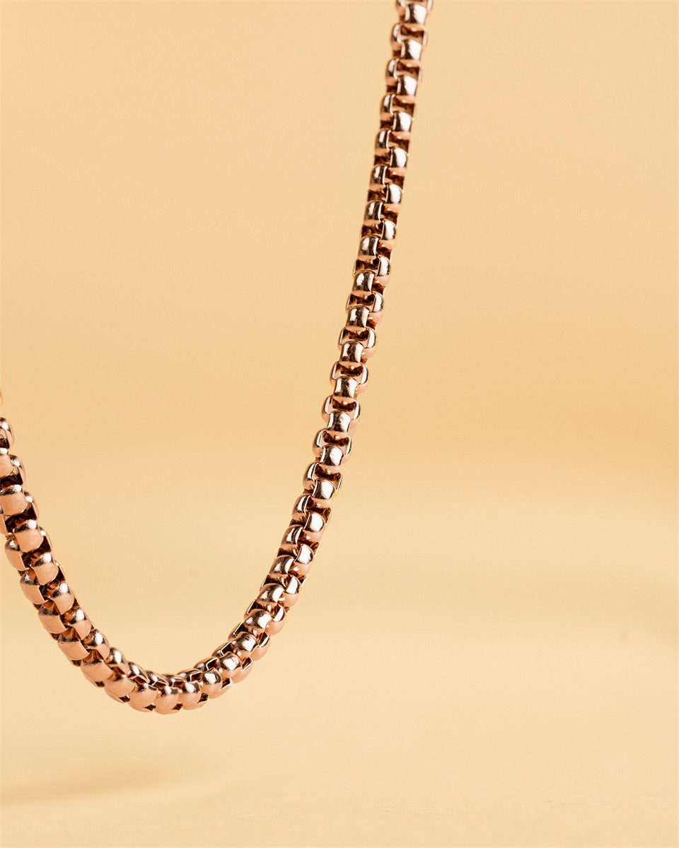 Die Vita Bronze-Halskette ist eine 3-mm-Kastenkette mit einer polierten bronzebeschichteten Oberfläche. Es besteht aus Edelstahl 316L und ist sehr leicht und langlebig. Sie können diese Halskette Tag für Tag ohne Sorgen tragen. Die Länge der Kette beträgt 54 cm und sie verfügt über eine 10 cm lange Verlängerungskette, die Sie bei Bedarf hinzufügen können.