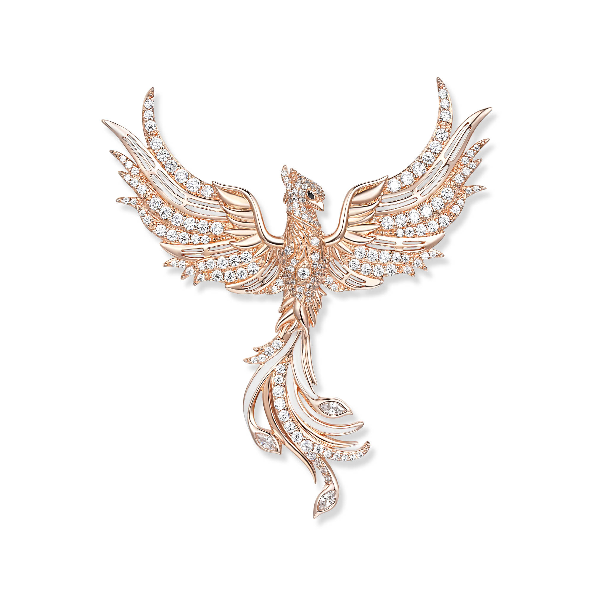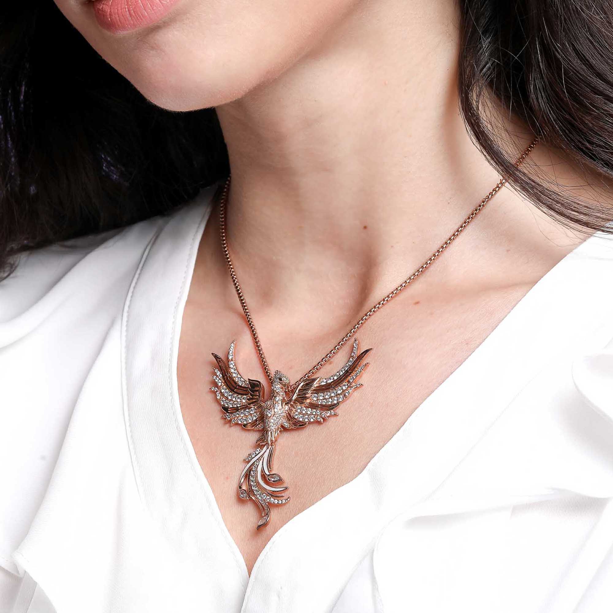 Der Ashara Phönix Anhänger aus der SEINERZEIT Dream Kollektion ist die luxuriöse rosévergoldete Version des ikonischen Flamara Phönix Anhängers. Gefertigt aus 925er Sterling Silber und veredelt mit einer hochwertigen 18k Rosévergoldung, kombiniert dieser Anhänger zeitlose Eleganz mit majestätischer Symbolik. Die gleichmäßig funkelnden weißen Zirkonia unterstreichen die filigrane Gestaltung der Flügel und die anmutige Form des Phönix, der für Wiedergeburt, Stärke und Transformation steht. Die sanfte Rosévergoldung harmoniert perfekt mit dem strahlenden Glanz der Zirkonia und verleiht dem Schmuckstück eine warme, edle Ausstrahlung. Als Protagonist der Dream Kollektion ist der Ashara Anhänger ein echtes Statement-Piece, das sowohl im Alltag als auch zu besonderen Anlässen getragen werden kann. Ob als persönliches Accessoire oder als bedeutungsvolles Geschenk – der Ashara Phönix Anhänger überzeugt durch seine hochwertige Verarbeitung, langlebigen Materialien und sein zeitlos schönes Design.