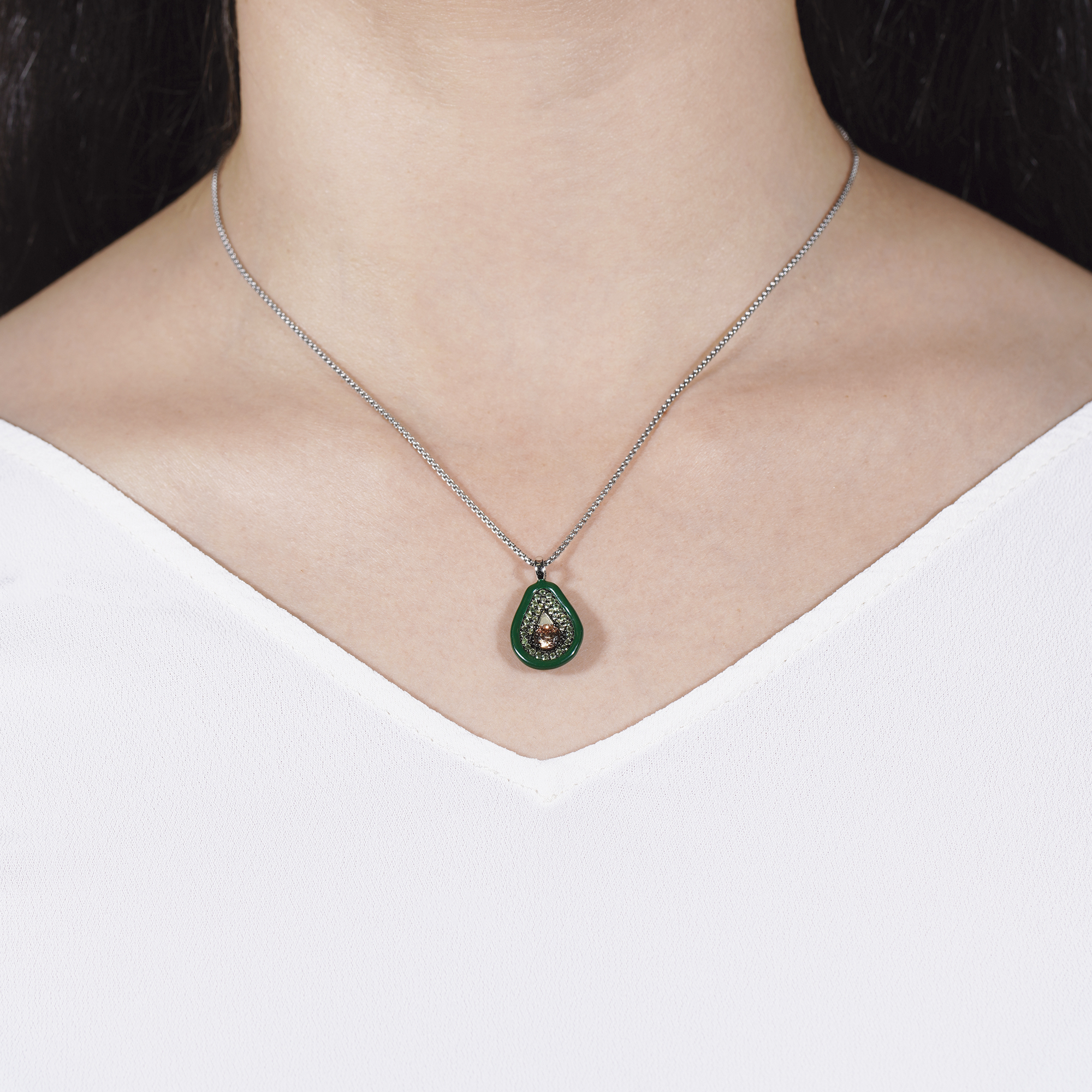 Der Avo Avocado Anhänger ist ein bezauberndes Schmuckstück aus hochwertigem 925 Sterling Silber, das mit einer rhodinierten Beschichtung veredelt wurde. Das Design des Anhängers ist von einer reifen Avocado inspiriert und verleiht Ihrem Outfit einen trendigen und verspielten Touch. Der große braune Zirkonia in der Mitte des Anhängers stellt den Kern der Avocado dar und fängt alle Blicke ein. Die grünen Zirkonia, die den äußeren Teil der Avocado schmücken, sorgen für einen frischen und lebendigen Akzent. Die präzise Verarbeitung und die hochwertigen Materialien machen diesen Anhänger zu einem langlebigen und qualitativ hochwertigen Schmuckstück. Tragen Sie den Avo Avocado Anhänger stolz als Symbol für Ihre Liebe zu Mode und Individualität.