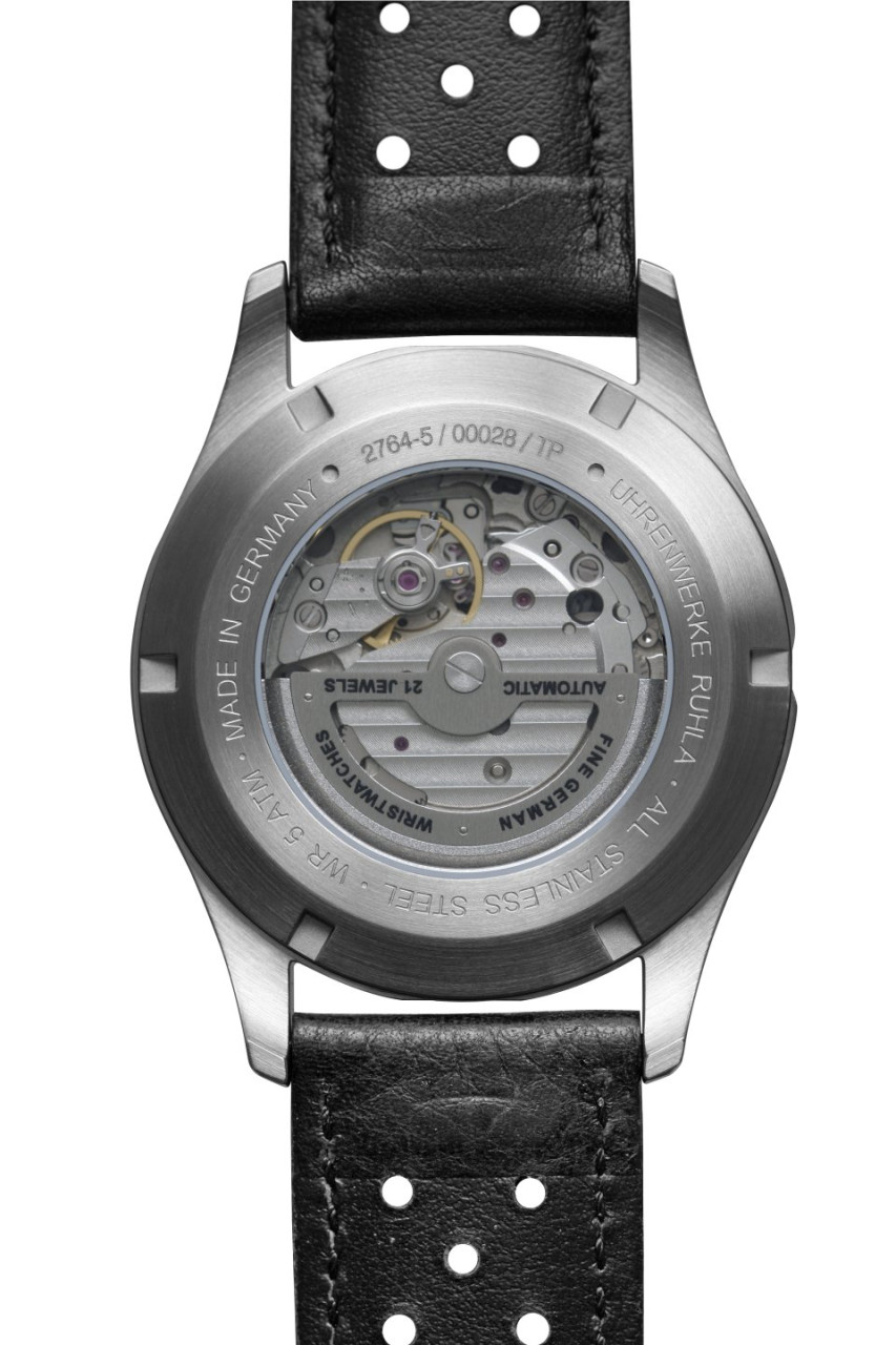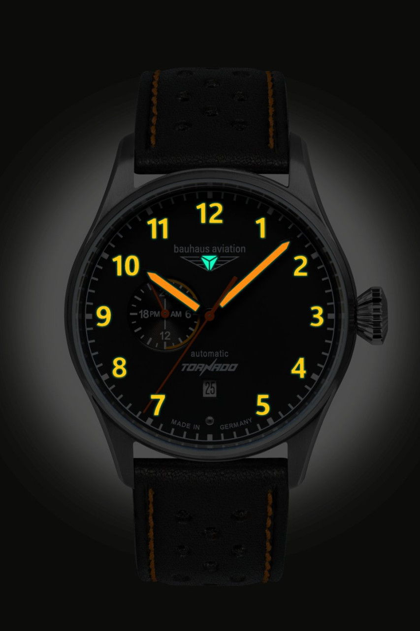 - Schwarzes Ziffernblatt mit orangen, nachts leuchtenden Zahlen/Indices, Leuchtzeigern