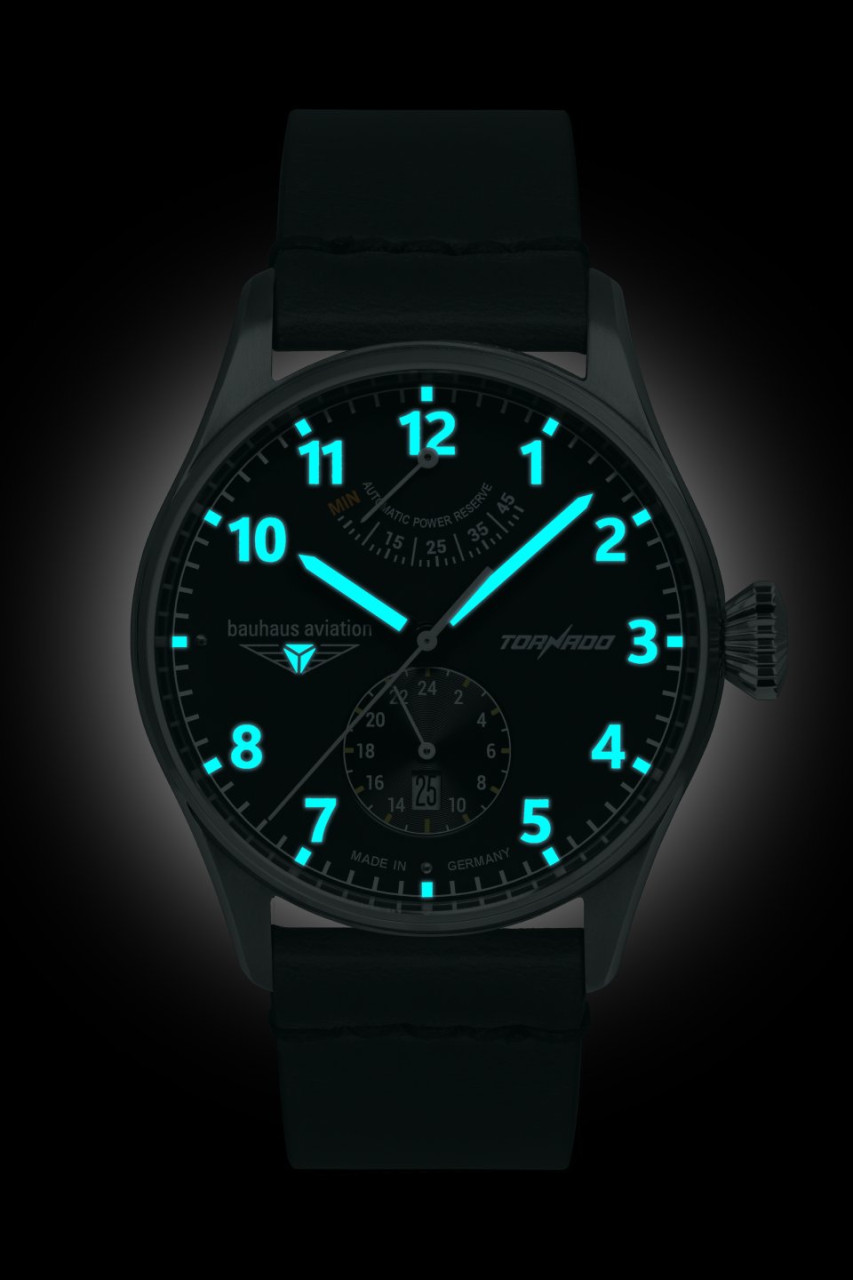 - Schwarzes Ziffernblatt mit hellblauen Zahlen/Indices, Leuchtzeigern