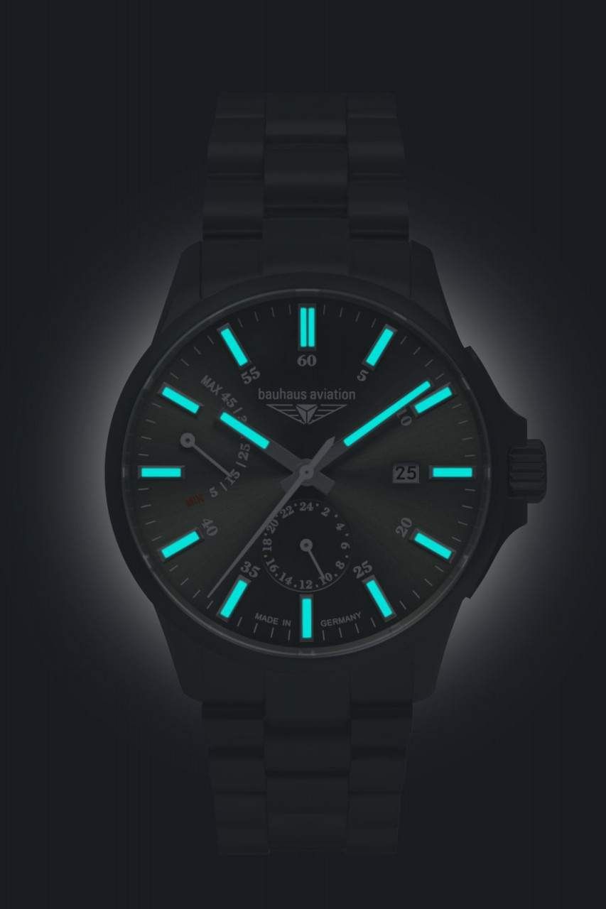 - Dunkelgrünes Ziffernblatt mit weißen, nachts leuchtenden Zahlen/Indices, Leuchtzeigern