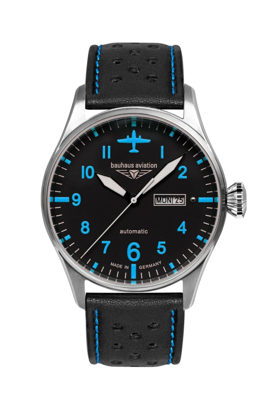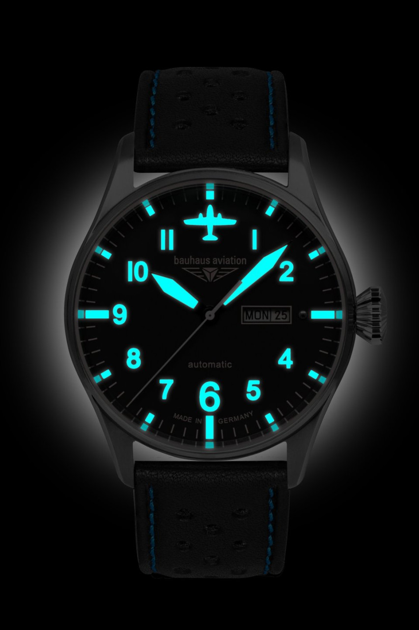 - Schwarzes Ziffernblatt mit blauen, nachts leuchtenden Zahlen/Indices, Leuchtzeigern