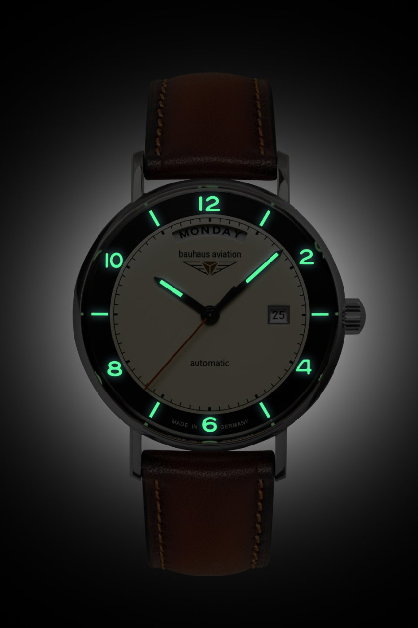 - Beiges Ziffernblatt mit beigen, nachts leuchtenden Zahlen/Indices, Leuchtzeigern