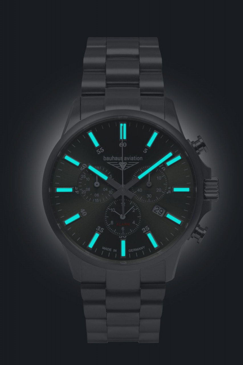 - Dunkelgrünes Ziffernblatt mit weißen, nachts leuchtenden Zahlen/Indices, Leuchtzeigern