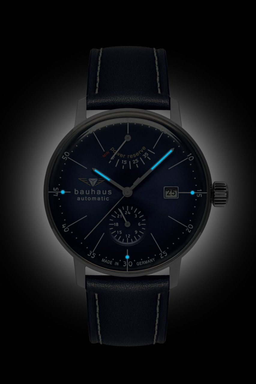 - Dunkelblaues Ziffernblatt mit weißen Zahlen/Indices, Leuchtzeigern, Leuchtpunkten
