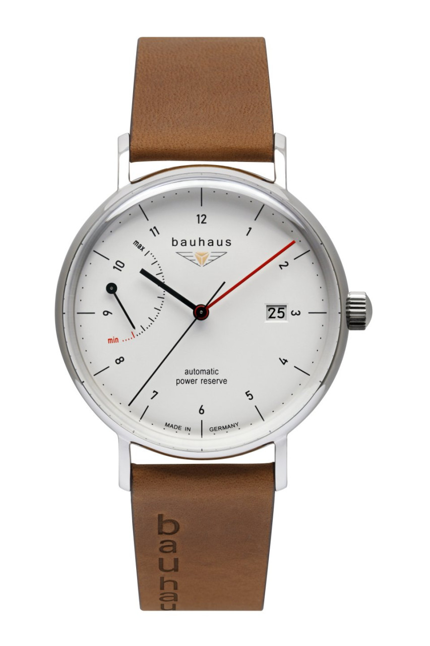 Die Automatik-Modelle der Referenz 2160 vereinen das minimalistische Design der Bauhaus-Serie mit der technischen Feinheit einer Gangreserveanzeige. Das weiße Zifferblatt, die zweifarbig ausgeführten Zeiger, das abgerundete Gehäuse und Glas verleihen dieser Uhr eine Anmutung von Qualität und Eleganz und machen Sie so zum i-Tüpfelchen für jeden Look. Poliertes Edelstahl, extra kratzfestes K1-Sicherheitsglas und ein Uhrwerk des japanischen Traditionsherstellers Citizen/MIYOTA, das man durch den Glasboden betrachten kann, lösen das Versprechen höchster Qualität ein.