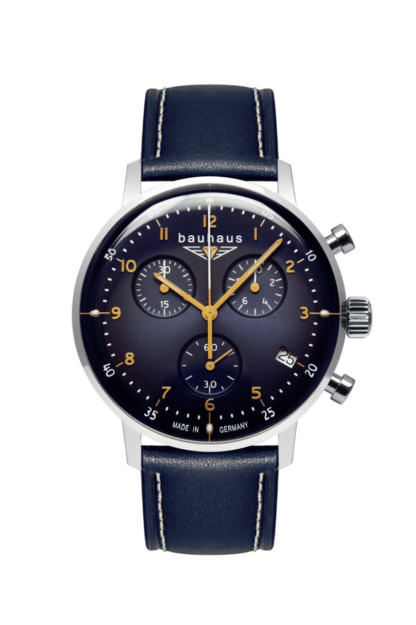 - Dunkelblaues Ziffernblatt mit goldfarbenen Zahlen/Indices, Leuchtzeigern