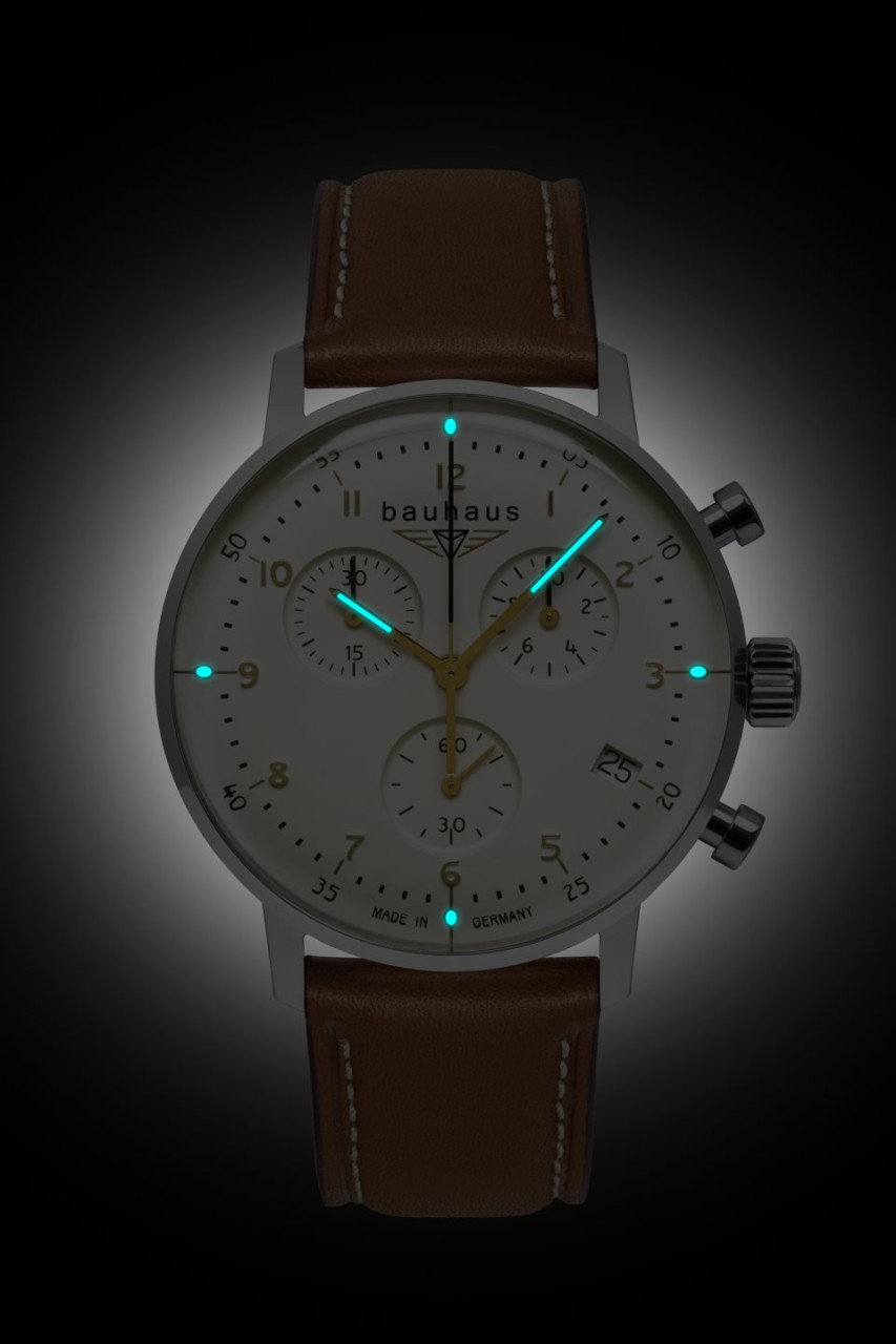 - Weißes Ziffernblatt mit goldfarbenen Zahlen/Indices, Leuchtzeigern