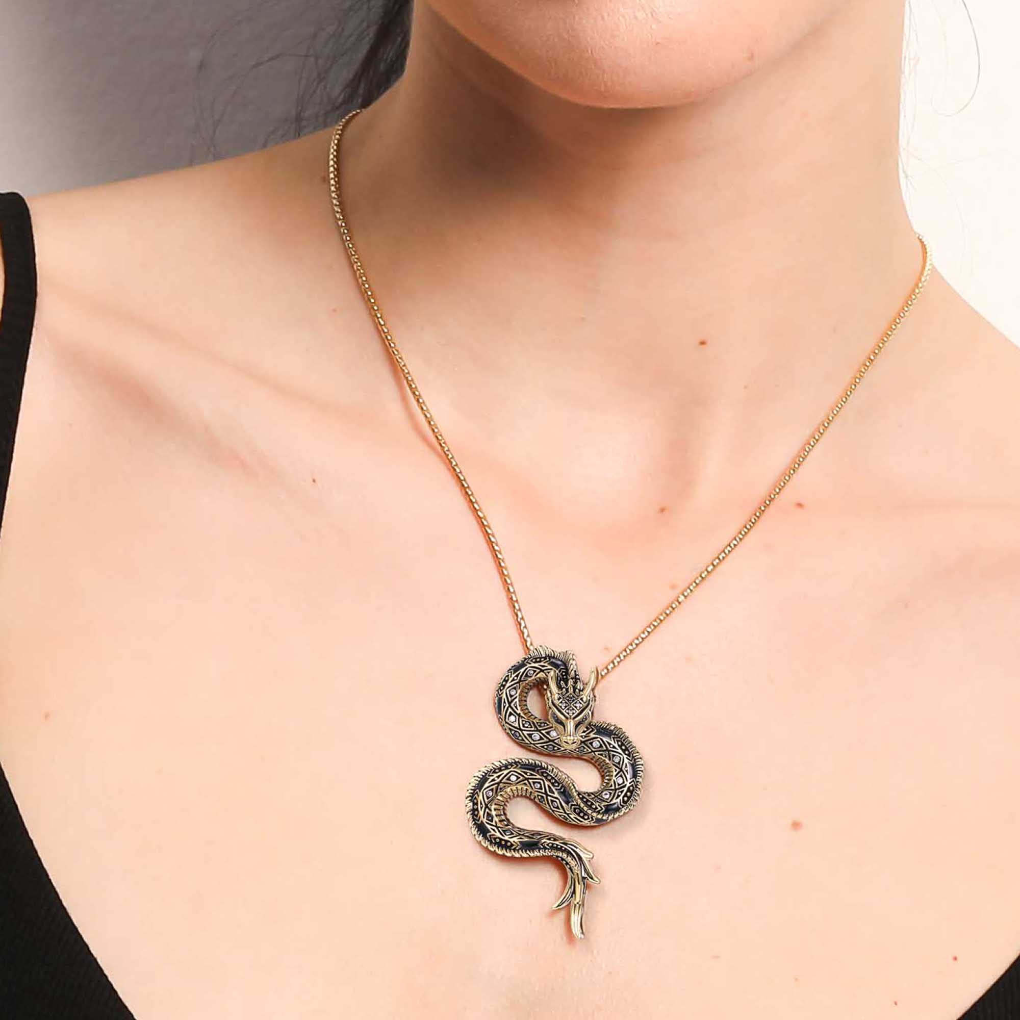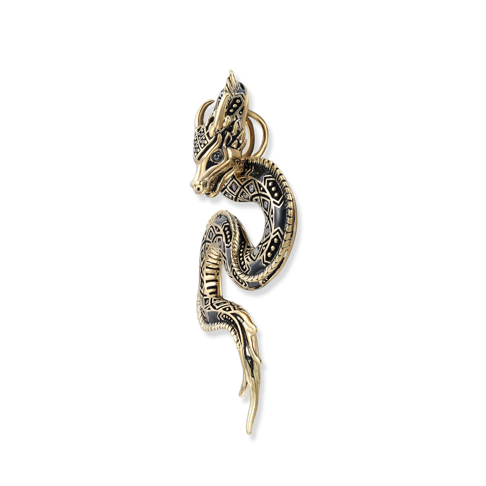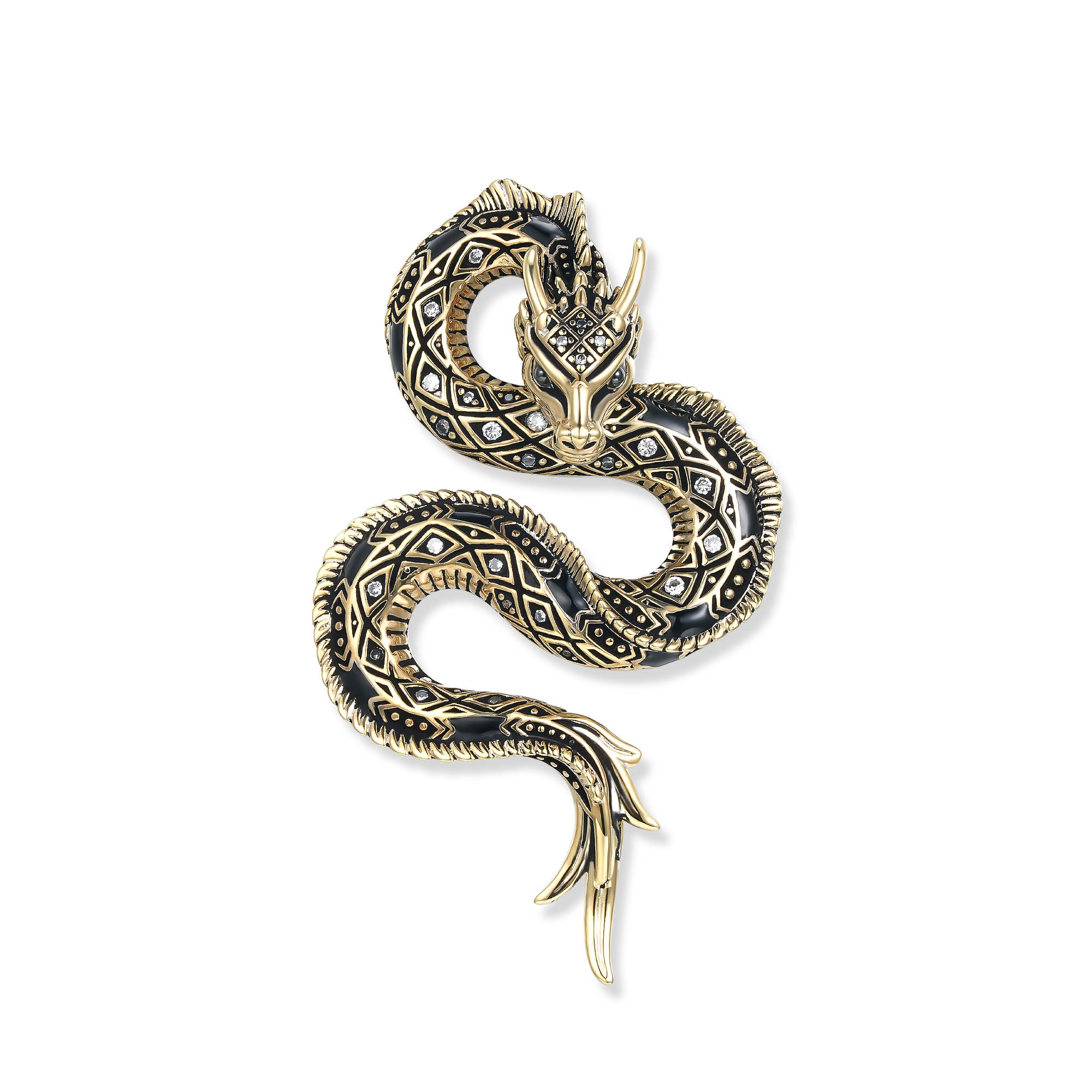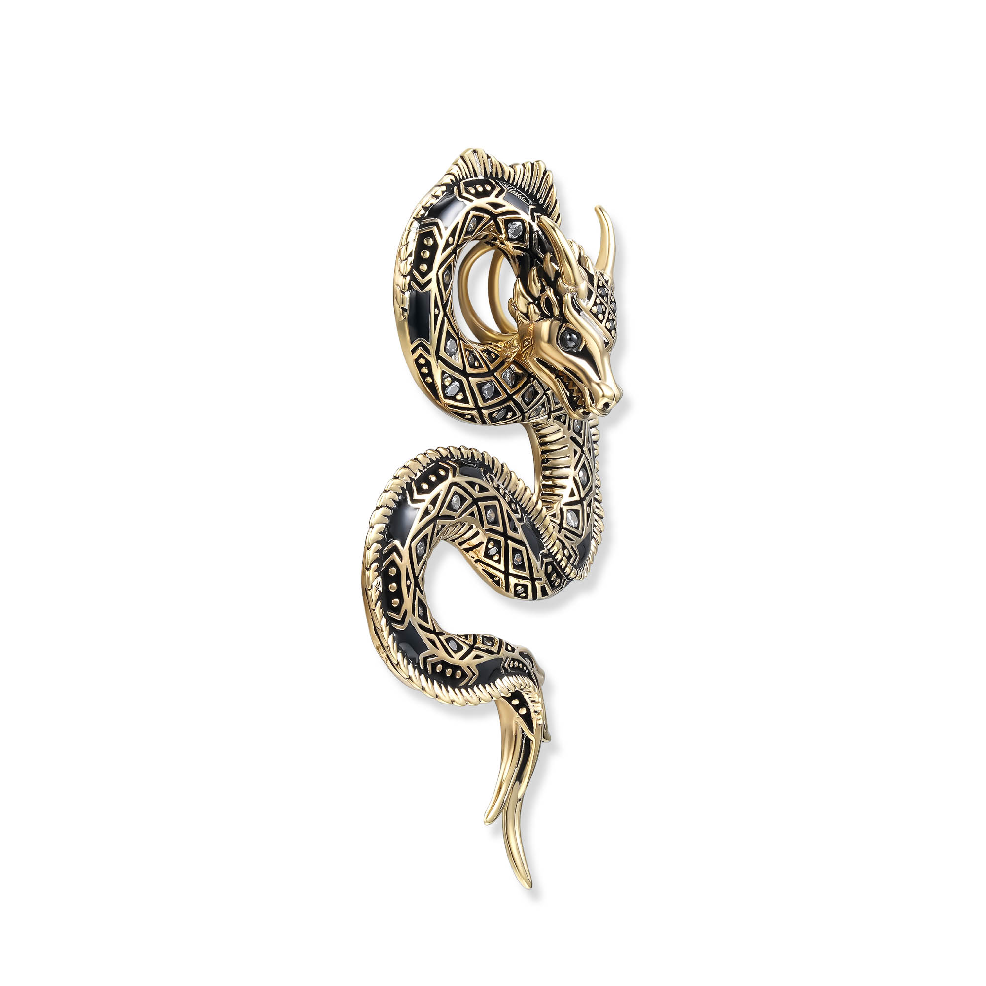 Der Belarius Drachen Anhänger aus der SEINERZEIT Noctis Kollektion ist die luxuriöse 18k vergoldete Version des imposanten Drakonis Anhängers und ein beeindruckendes Statement-Piece für Männer und Frauen. Gefertigt aus hochwertigem 925er Sterling Silber und veredelt mit einer intensiven 18k Vergoldung, strahlt dieser Anhänger Eleganz und Stärke aus. Die kunstvoll geschwungene Form des Drachenkörpers mit fein detaillierter Textur symbolisiert Macht, Schutz und Weisheit, während schwarze Zirkonia dem Design ein markantes Funkeln verleihen. Der Belarius Anhänger ist perfekt für Liebhaber von Fantasy und kraftvollem Schmuck, die ein ausdrucksstarkes und zugleich elegantes Accessoire suchen. Mit seinem Unisex Design passt der Anhänger zu jedem Stil und ist sowohl für den Alltag als auch für besondere Anlässe geeignet. Die Kombination aus luxuriöser 18k Vergoldung, funkelnden Zirkonia und exzellenter Verarbeitung macht dieses Schmuckstück langlebig und besonders hochwertig. Ob als persönliches Statement-Piece oder als stilvolles Geschenk, der Belarius Drachen Anhänger setzt ein kraftvolles Zeichen von Individualität und Stil.