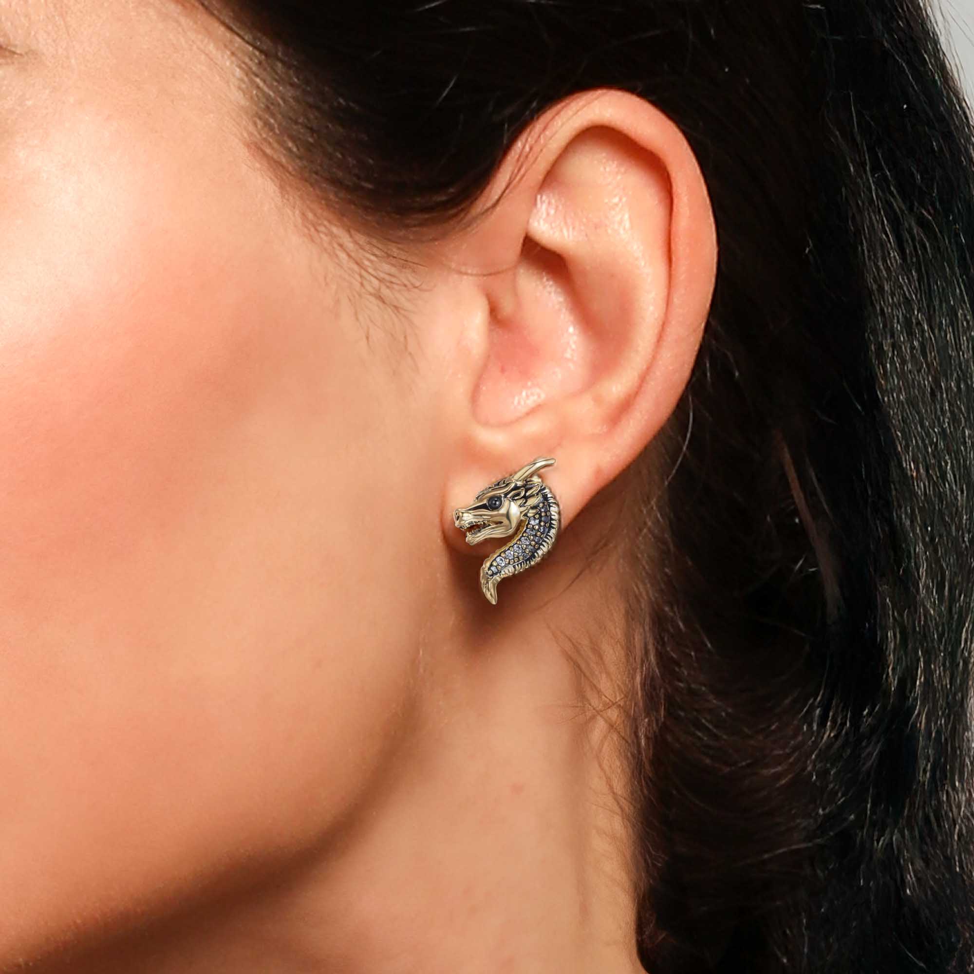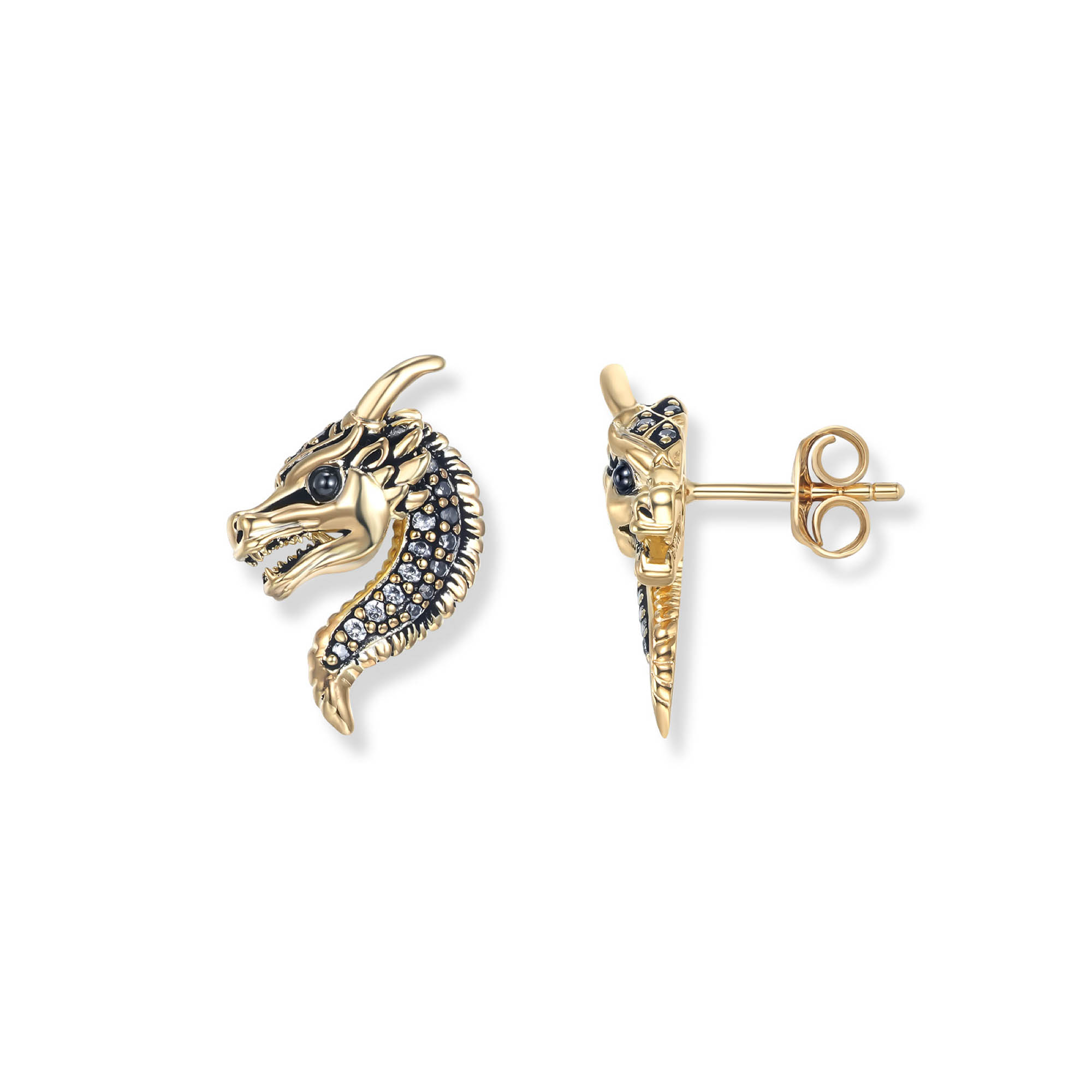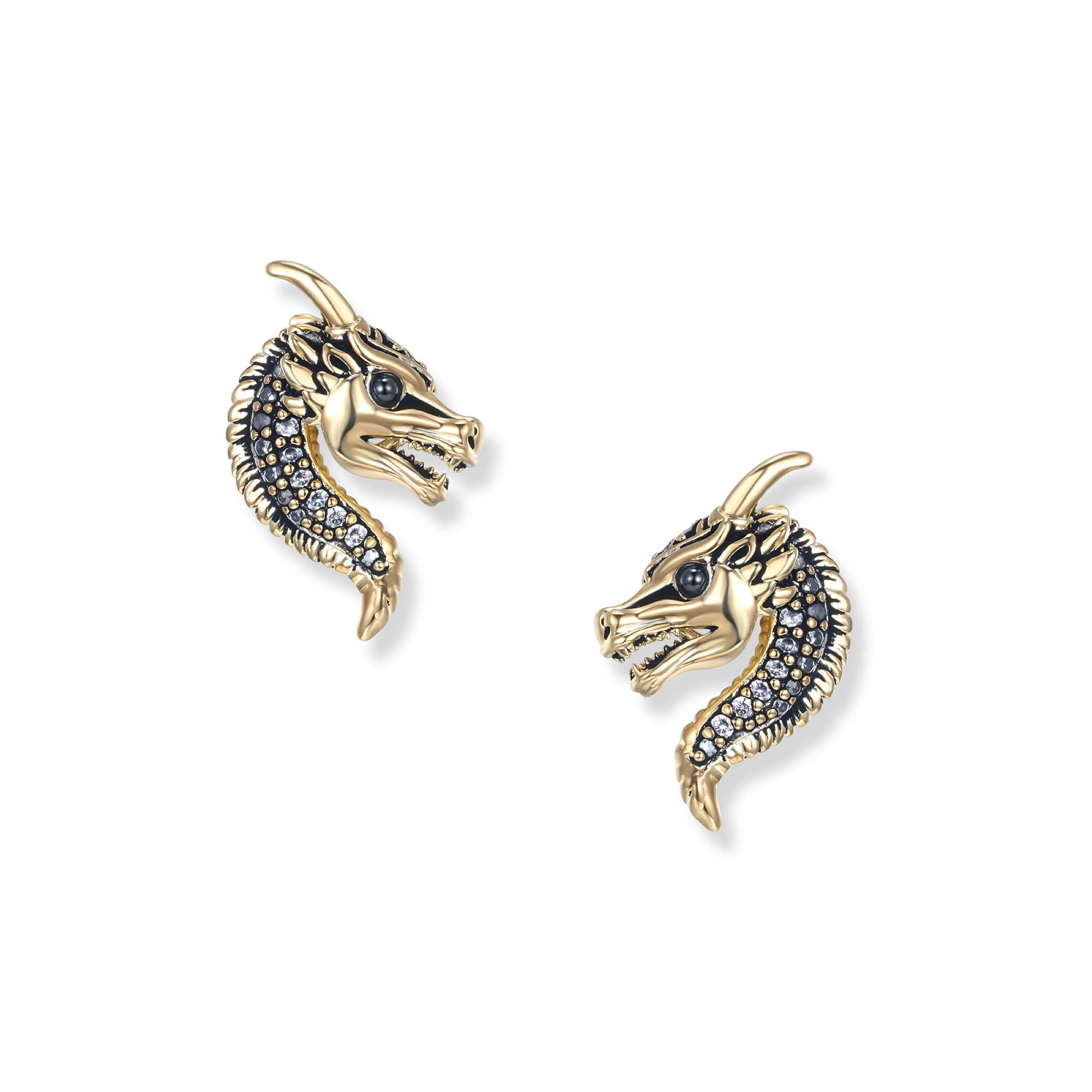 Die Belarius Drachen Ohrstecker aus der SEINERZEIT Noctis Kollektion sind die perfekte Ergänzung zum Belarius Drachen Anhänger und vereinen luxuriöses Design mit kraftvoller Symbolik. Gefertigt aus hochwertigem 925er Sterling Silber und veredelt mit einer intensiven 18k Vergoldung, verkörpern diese Ohrstecker Eleganz und Mystik. Die detailgetreu gearbeiteten Drachenköpfe, verziert mit funkelnden schwarzen Zirkonia, strahlen eine geheimnisvolle Aura aus und sind ein markantes Accessoire für jeden Anlass. Ihr Unisex Design macht sie ideal für Männer und Frauen, die ein stilvolles und bedeutungsvolles Schmuckstück suchen. Die robuste Verarbeitung und die präzise Platzierung der Zirkonia garantieren Langlebigkeit und ein edles Finish. Die Belarius Drachen Ohrstecker sind sowohl eigenständig ein beeindruckendes Schmuckstück als auch die perfekte Ergänzung zum Belarius Drachen Anhänger, wodurch sie ein vollständiges Set für Liebhaber von Fantasy und kraftvollem Schmuck bilden. Ob als persönliches Accessoire oder als Geschenk – diese Ohrstecker setzen ein Statement und verleihen jedem Look eine mystische und luxuriöse Note.