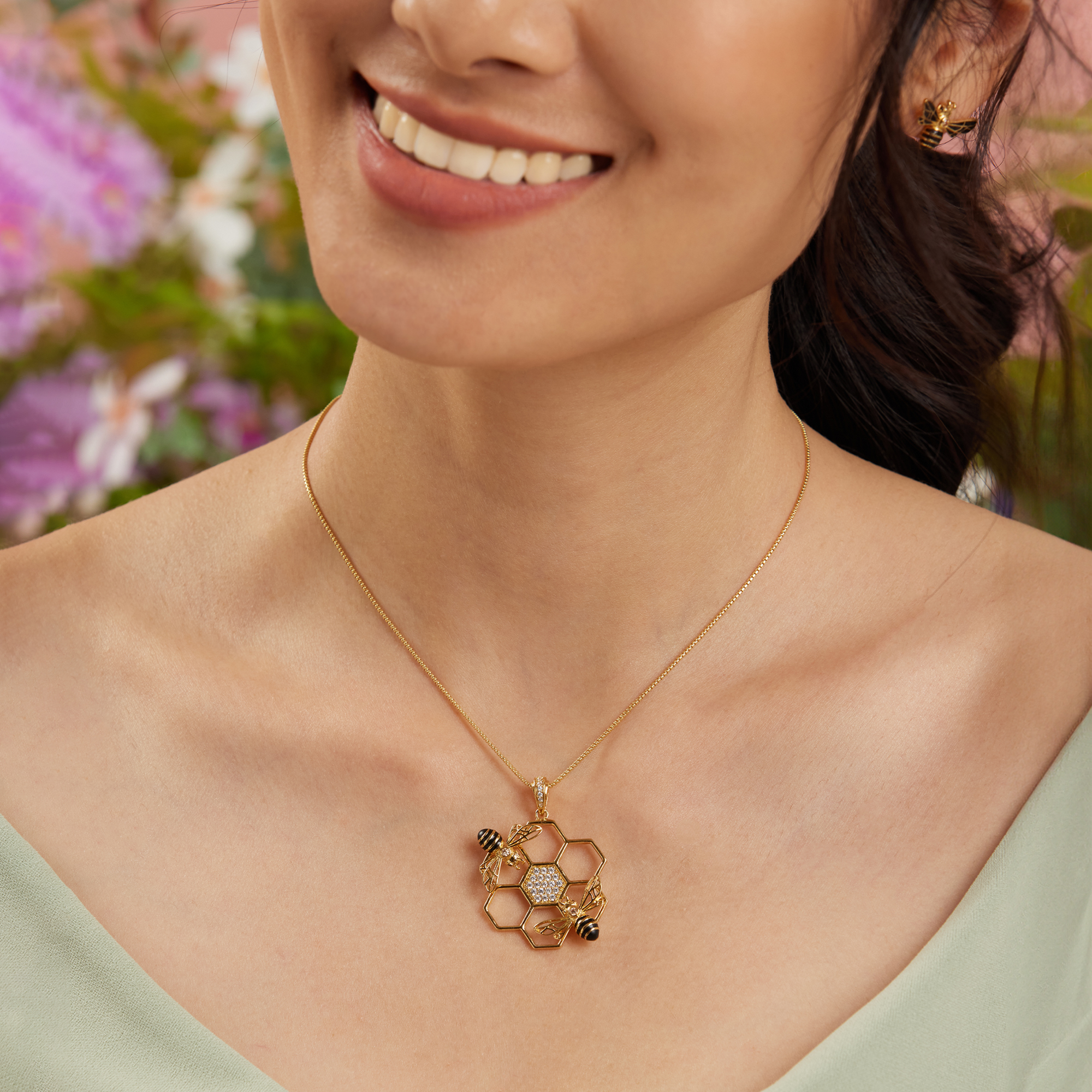 Der Bommel Bienen Anhänger ist eine bezaubernde Hommage an das Bienenreich, handgefertigt aus feinstem Sterling Silber und kunstvoll mit einer verführerischen 18K Vergoldung versehen. Die Form des Anhängers präsentiert eine Bienenwabe, auf der zwei gegenüberliegende Bienen platziert sind, die durch ihre symmetrische Anordnung eine harmonische Balance schaffen. Die zentrale Wabe wird von funkelnden Zirkonia verziert, die das Licht einfangen und den Anhänger in einem sanften Glanz erstrahlen lassen. Diese kunstvolle Gestaltung des Schmuckstücks verleiht nicht nur eine honigsüße Ästhetik, sondern symbolisiert auch die Gemeinschaft und Harmonie im Bienenvolk. Der Bommel Bienen Anhänger ist mehr als nur ein Schmuckstück; er erzählt eine Geschichte von Fleiß, Zusammenarbeit und der süßen Belohnung, die aus der gemeinsamen Arbeit entsteht. Tragen Sie diesen Anhänger, um Ihre Wertschätzung für die Natur und die beeindruckende Welt der Bienen auszudrücken. Der Bommel Bienen Anhänger - eine honigsüße Kreation für Liebhaber von Ästhetik und Naturschönheit.