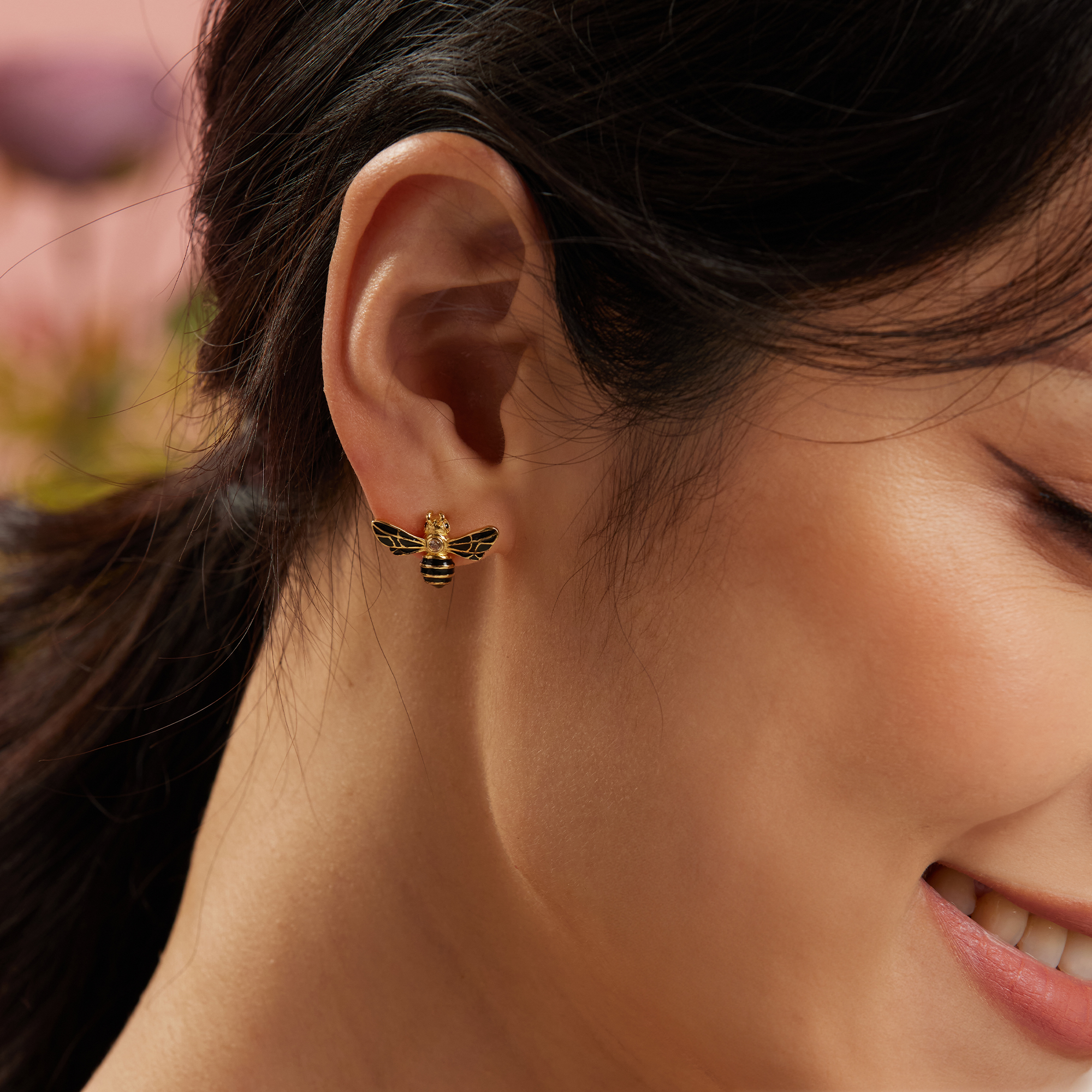 Die Bommel Bienen Ohrringe sind ein entzückendes Schmuckstück, das die Faszination für das Bienenreich in feinster Handwerkskunst widerspiegelt. Hergestellt aus hochwertigem 925 Sterling Silber und kunstvoll mit einer liebevollen 18K Vergoldung veredelt, präsentieren diese Ohrringe kleine Bienenstecker. Die schwarze Emaille auf den Flügeln verleiht den Ohrringen eine charmante Note und betont gleichzeitig die Detailreichtum der Bienen. Niedlich und liebevoll gestaltet, sind diese Ohrringe nicht nur eine passende Ergänzung zum Bommel Bienen Anhänger, sondern harmonieren auch hervorragend mit dem Bella Bienen Schmuckstück, um ein bezauberndes Duo zu schaffen. Tragen Sie diese Bommel Bienen Ohrringe, um Ihre Liebe zur Natur und zur Ästhetik auszudrücken. Die kleinen Bienenstecker sind nicht nur ein visuelles Statement, sondern auch eine süße Erinnerung an die Bedeutung der Bienen in unserer Umwelt. Ein bezauberndes Duo für Naturliebhaber und Ästheten gleichermaßen.