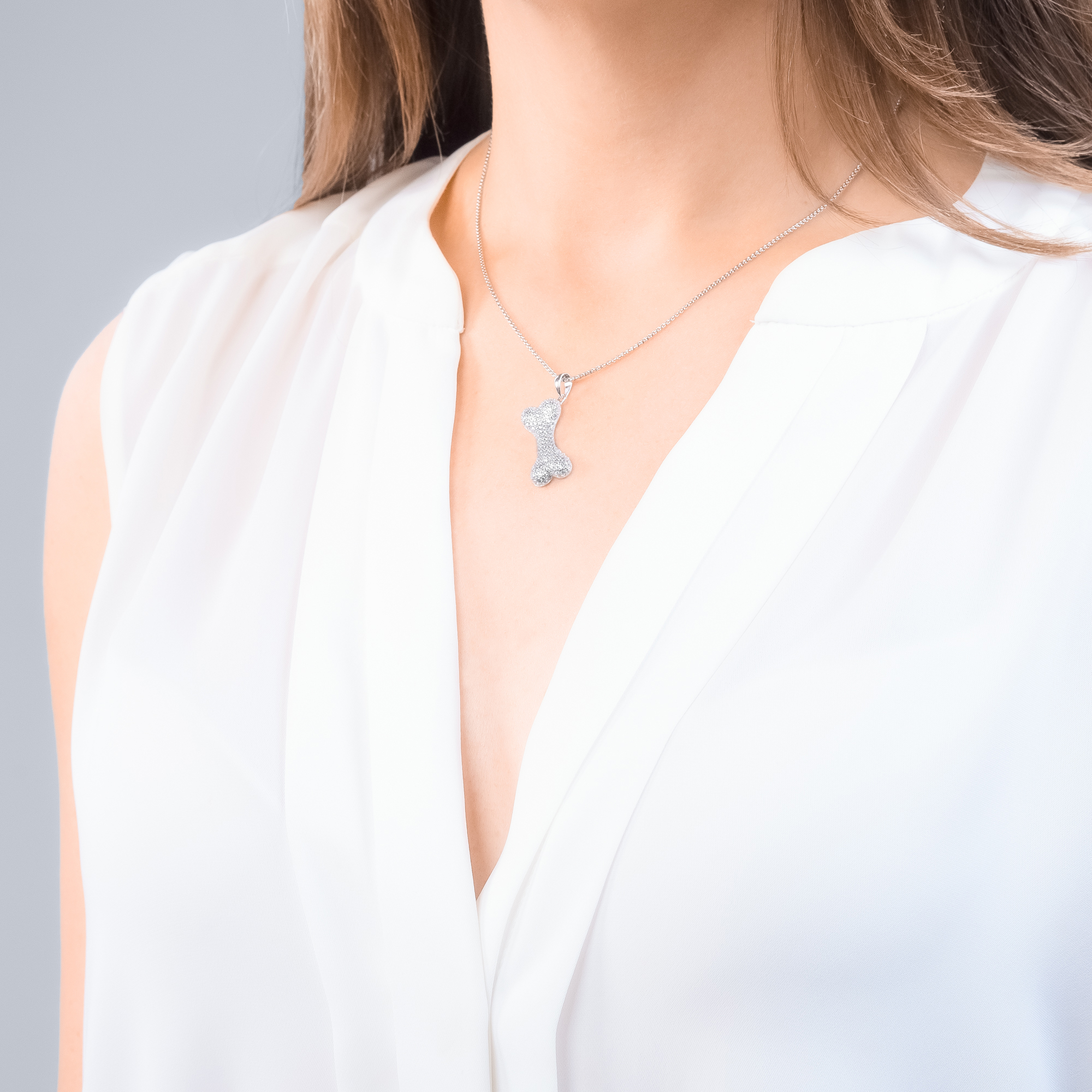 Der Anhänger ist in Form eines zarten Knochens gestaltet, der die symbolische Bedeutung der Liebe zu Hunden trägt. Die einfarbigen Zirkonia Steine in Weiß, die den Anhänger zieren, symbolisieren die Freude und den Glanz, den Hunde in unser Leben bringen. Dieser Anhänger ist nicht nur ein Schmuckstück, sondern auch eine Erinnerung an die besondere Beziehung zwischen Mensch und Hund.