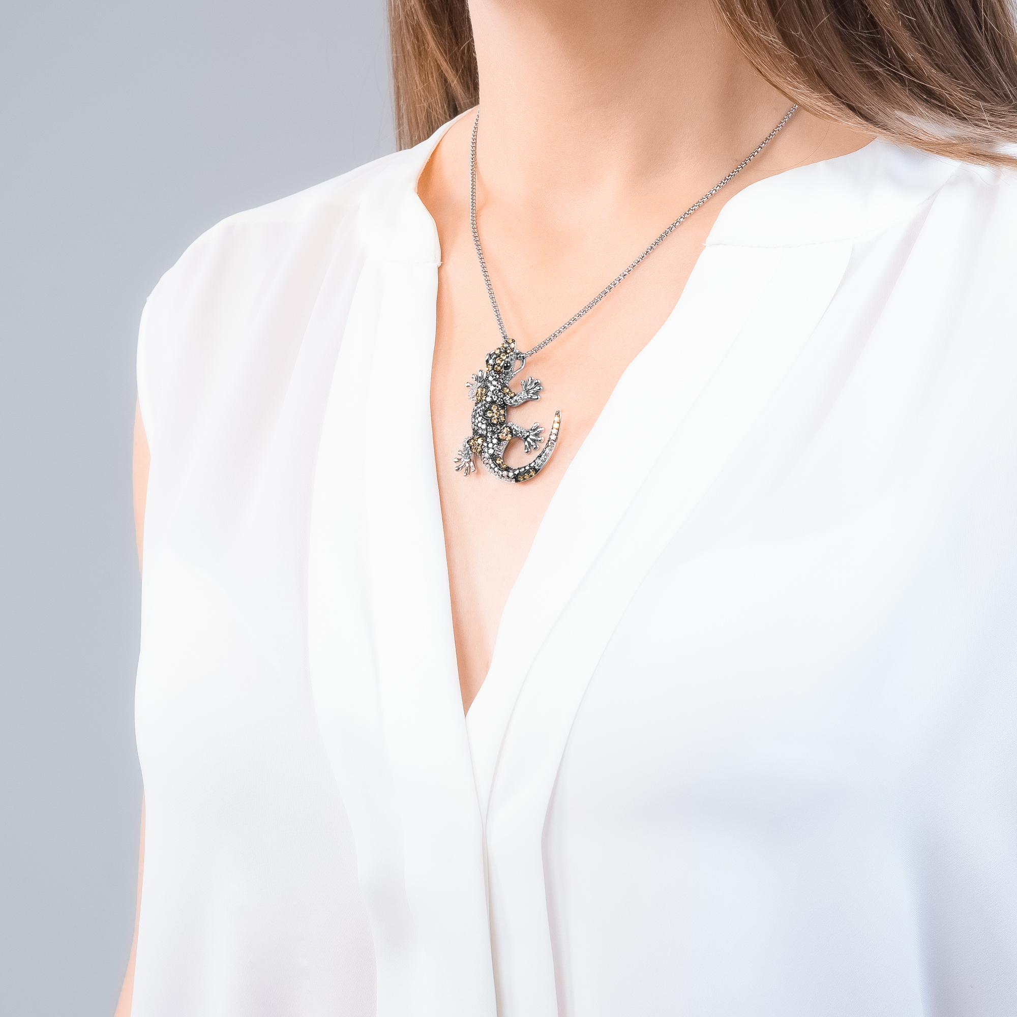 Der Chiko Salamander Anhänger präsentiert einen kunstvoll gestalteten Salamander in einer faszinierenden Pose. Die Zirkonia Steine wurden geschickt platziert, um dem Anhänger subtilen Glanz zu verleihen und seine Schönheit zu betonen. Dieser Anhänger ist mehr als nur Schmuck – er ist ein Statement-Accessoire, das Ihre Persönlichkeit unterstreicht. Die Mischung aus den warmen Brauntönen und dem funkelnden Weiß der Zirkonia Steine schafft einen reizvollen Kontrast.