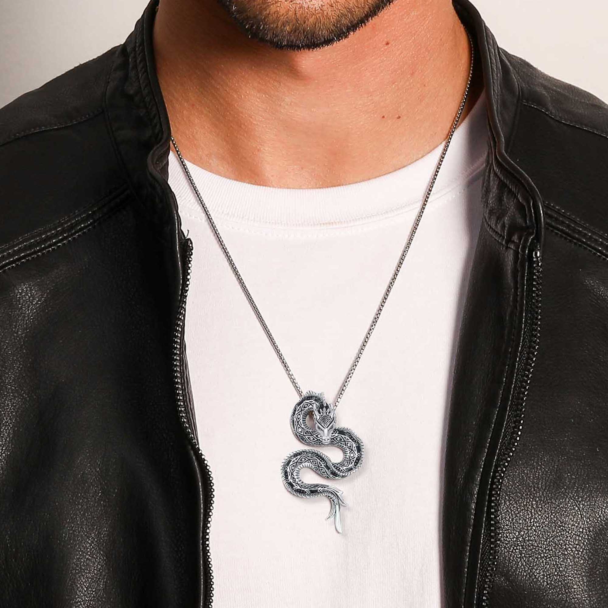 Der Drakonis Drachen Anhänger aus der SEINERZEIT Noctis Kollektion ist ein imposantes Schmuckstück, das die Mystik und Kraft des Drachen in einem außergewöhnlichen Design einfängt. Gefertigt aus 925er Sterling Silber und veredelt mit einer schwarzen Rhodium-Beschichtung, wirkt der Anhänger kraftvoll und modern. Die oxidierten Akzente verleihen ihm Tiefe und unterstreichen die detaillierte Gestaltung des geschwungenen Drachenkörpers, während funkelnde schwarze Zirkonia ein dramatisches Highlight setzen. Der Drakonis Anhänger symbolisiert Stärke, Weisheit und Schutz und ist das perfekte Statement-Schmuckstück für Liebhaber von Fantasy und Mythologie. Die hochwertige Verarbeitung und die robusten Materialien machen diesen Anhänger langlebig und ideal für den Alltag oder besondere Anlässe. Als Teil der exklusiven Noctis Kollektion ist der Drakonis Drachen Anhänger mehr als nur Schmuck – er ist ein kraftvolles Accessoire für einen markanten, individuellen Stil. Ob als persönliches Statement-Piece oder als außergewöhnliches Geschenk, dieses Schmuckstück zieht garantiert alle Blicke auf sich und verleiht jedem Look eine mystische, kraftvolle Note.