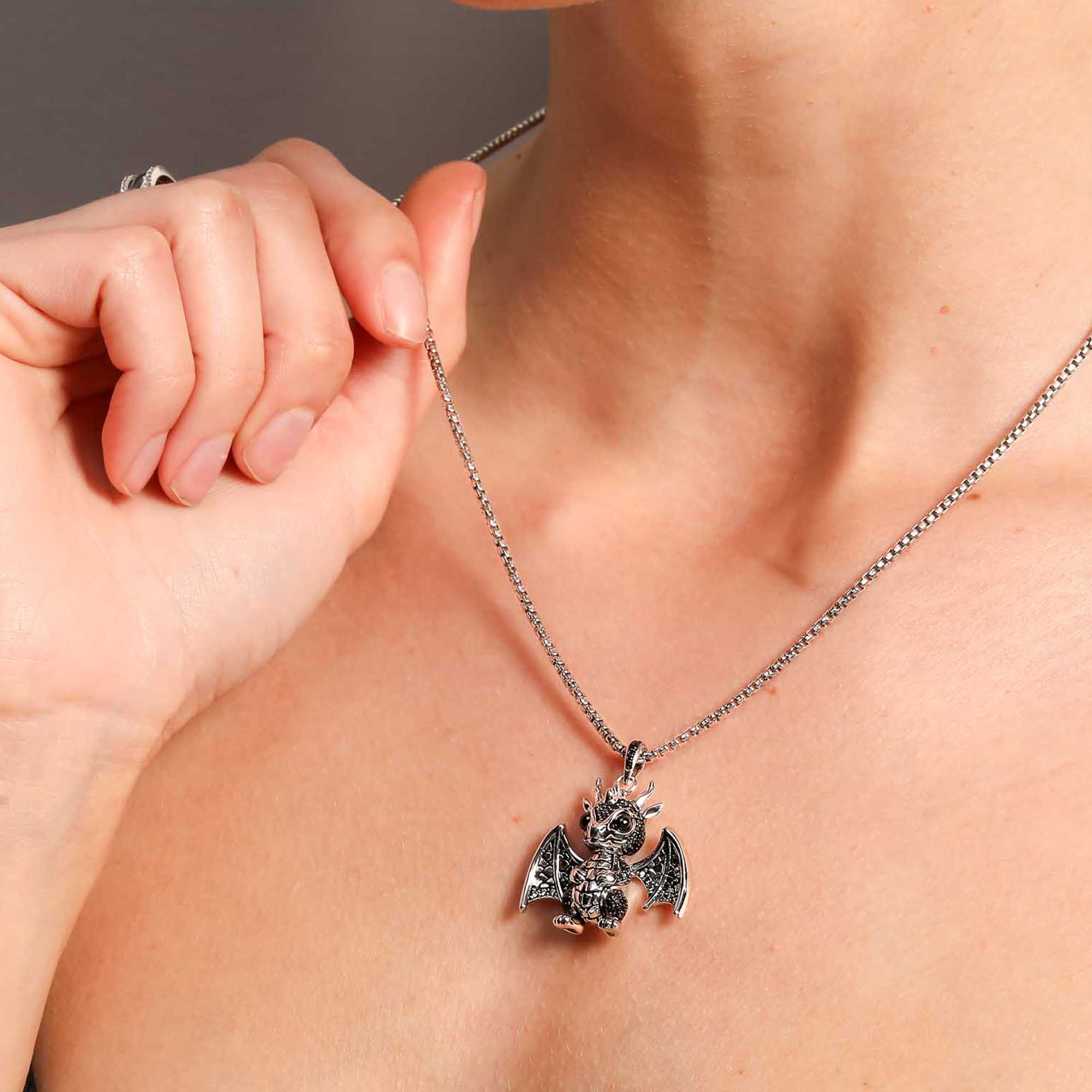 Der Draky Drachen Anhänger ist ein bezauberndes Schmuckstück, das die mystische Welt der Drachen mit einem niedlichen und zugleich eleganten Design vereint. Der Babydrache aus hochwertigem 925er Sterling Silber ist mit einer luxuriösen schwarzen Rhodium-Beschichtung versehen, die dem Anhänger einen modernen und geheimnisvollen Look verleiht. Funkelnde schwarze Zirkonia betonen die filigranen Details des Drachenkörpers und seiner ausgebreiteten Flügel, während die niedliche Gestaltung des Drachenkopfs mit großen, leuchtenden Augen seinen einzigartigen Charme unterstreicht. Dieser Anhänger ist das perfekte Accessoire für Fans von Fantasy und außergewöhnlichem Schmuck und eignet sich ideal als Geschenk oder als stilvolles Statement-Piece. Als Teil der exklusiven SEINERZEIT Flora & Fauna Kollektion verbindet der Draky Drachen Anhänger hochwertige Verarbeitung mit einem kreativen und einzigartigen Design. Die robuste Verarbeitung aus Sterling Silber und die rhodinierte Oberfläche garantieren Langlebigkeit und Schutz vor Anlaufen, während die sorgfältig platzierten Zirkonia ein faszinierendes Funkeln hinzufügen. Ob im Alltag oder zu besonderen Anlässen – dieses Schmuckstück bringt einen Hauch von Magie und Verspieltheit in jede Schmuckkollektion.