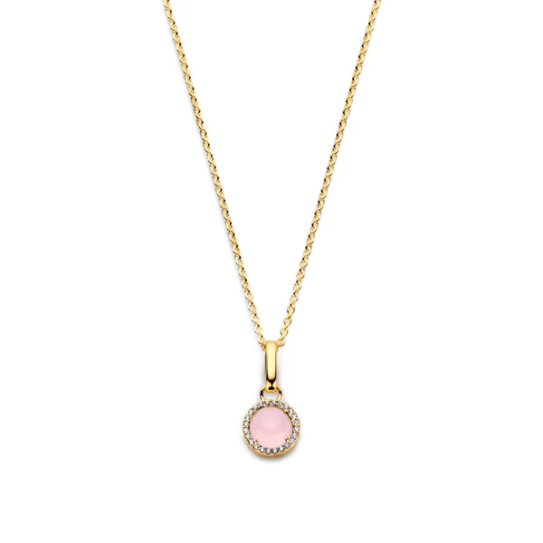 Die Euphoria Halskette wurde mit einem pinken Achat inmitten von schönen Zirkonia Steinen entworfen. Mit der Euphoria Halskette verleihst du deinem Outfit einen Hauch von Glamour. Die Länge ist einstellbar auf 42-45cm und gefertigt aus 925 recyceltem Sterlingsilber, vergoldet mit 18kt Gold. Die Euphoria Halskette ist eines unserer absoluten Lieblingsstücke aus der Kollektion.