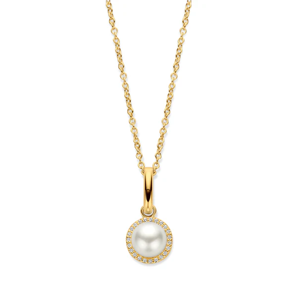 Die feminine Euphoria Halskette ist aus 925 recyceltem Sterlingsilber gefertigt, mit 18K Gold überzogen und mit einer Süßwasserperle in der Mitte umgeben von Zirkonia Steinen. Die Euphoria Halskette ist eines unserer absoluten Lieblingsstücke aus der Kollektion.