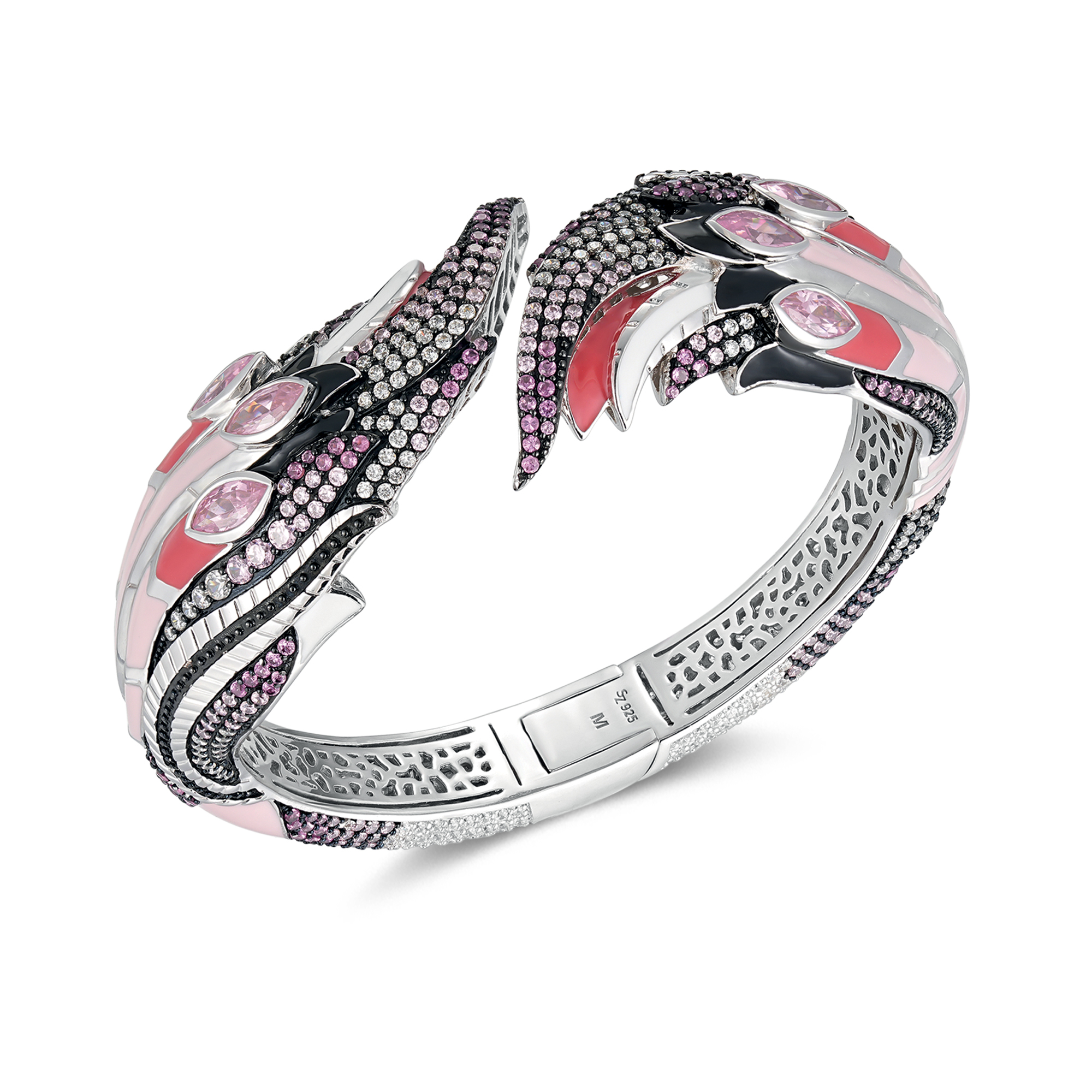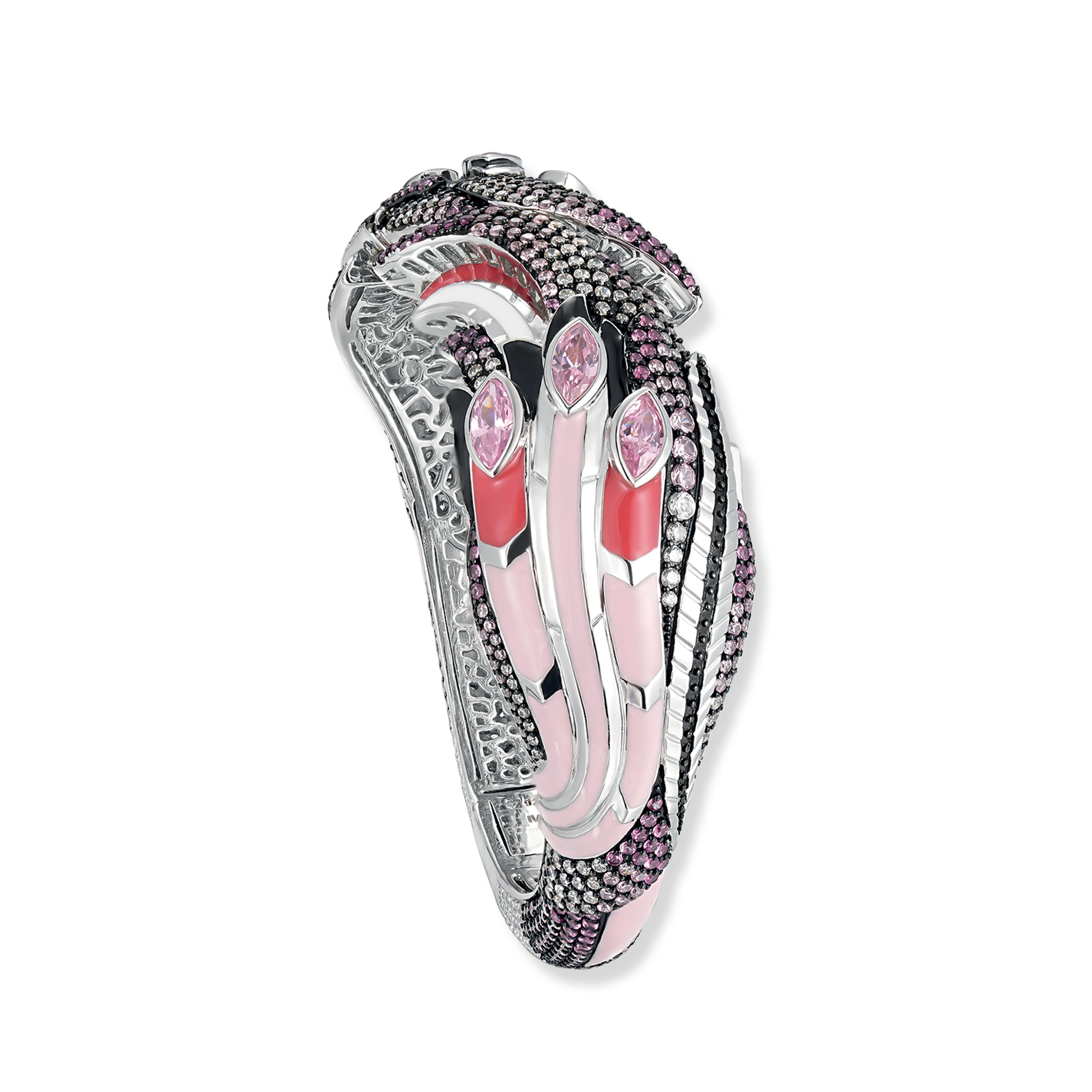 Die rhodinierte Fabio Flamingo Armspange ist das anspruchsvolle Gegenstück zur vergoldeten Fiola Flamingo Armspange, beide Kunstwerke aus Silber 925. Diese rhodinierte Variante zeigt sich in einer offenen, federartigen Form des Flamingos, die mit raffinierter Eleganz beeindruckt. Die Armspange ist nicht nur ein Schmuckstück, sondern eine kunstvolle Inszenierung von Stil und Anmut. Die schwarze Emaille verleiht der Silhouette des Flamingos eine ausdrucksstarke Note, während die Fuchsia Emaille einen lebendigen Kontrast setzt. Die Pink und weißen Zirkonia sind geschickt platziert, um subtile Akzente zu setzen und dem Design einen Hauch von Luxus zu verleihen. Mit dieser rhodinierten Fabio Flamingo Armspange tragen Sie nicht nur ein Accessoire, sondern ein Kunstwerk, das Ihre Persönlichkeit unterstreicht. Die Armspange lässt sich leicht anlegen und ist so konzipiert, dass sie sowohl im Alltag als auch zu besonderen Anlässen eine stilvolle Ergänzung darstellt. Lassen Sie sich von der zeitlosen Eleganz dieses Schmuckstücks verführen und setzen Sie ein beeindruckendes Statement mit der rhodinierten Fabio Flamingo Armspange.