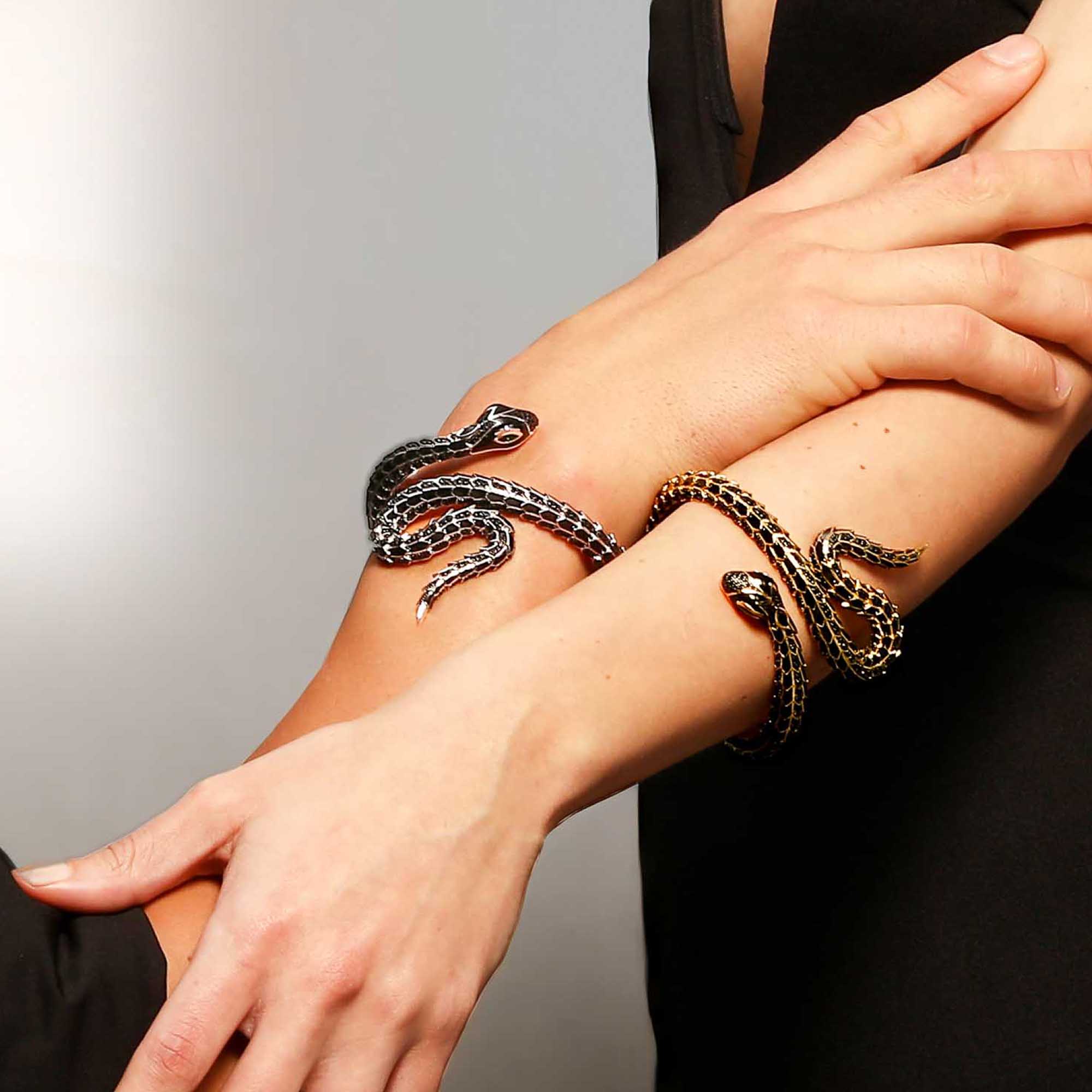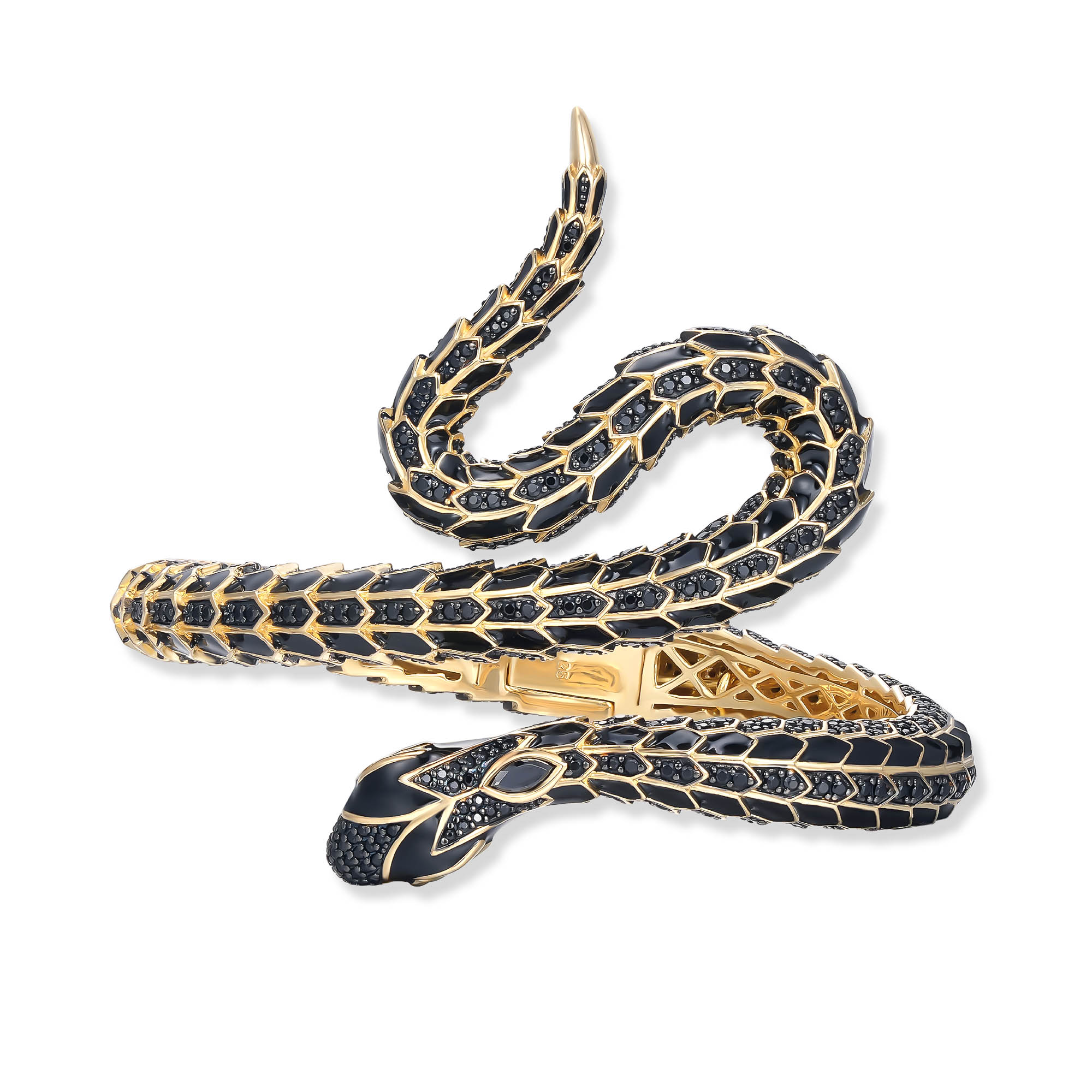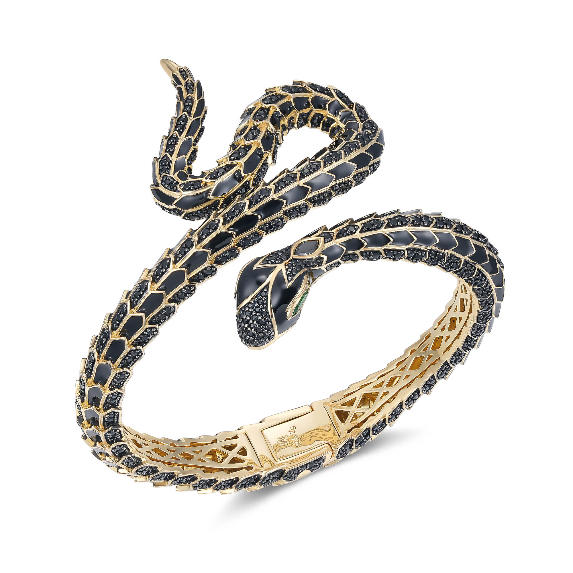 Die Fangor Schlangen Armspange aus der SEINERZEIT Noctis Kollektion ist ein wahres Meisterwerk der Schmuckkunst. Dieses luxuriöse Schmuckstück aus 18k vergoldetem Sterling Silber verkörpert Stärke, Eleganz und Mystik in einem beeindruckenden Design. Die kunstvoll gearbeiteten Schuppen der Schlange, verziert mit funkelnden schwarzen Zirkonia, erinnern an die Rüstung eines Drachen und verleihen der Armspange eine kraftvolle Präsenz. Besonders faszinierend sind die smaragdgrünen Zirkonia-Augen im Marquise-Schliff, die den majestätischen Ausdruck der Schlange perfekt zur Geltung bringen. Die geschmeidige Form der Armspange schmiegt sich elegant um das Handgelenk, während die Schlange scheinbar lebendig wird und mit bedrohlicher Anmut über den Handrücken blickt. Die warme 18k Vergoldung unterstreicht die luxuriöse Optik dieses Schmuckstücks und macht die Fangor Armspange zu einem unverzichtbaren Accessoire für jeden, der ein Statement setzen möchte. Ob zu besonderen Anlässen oder als kraftvolles Highlight im Alltag – die Fangor Schlangen Armspange ist ein Symbol für Transformation, Stärke und Stil.
