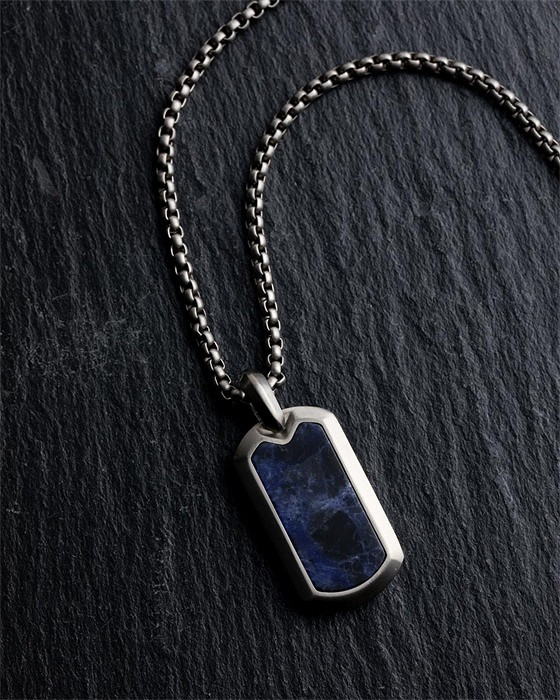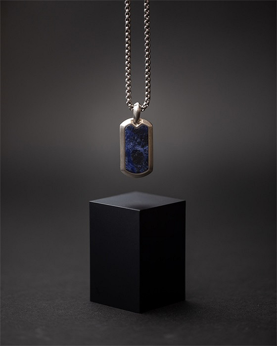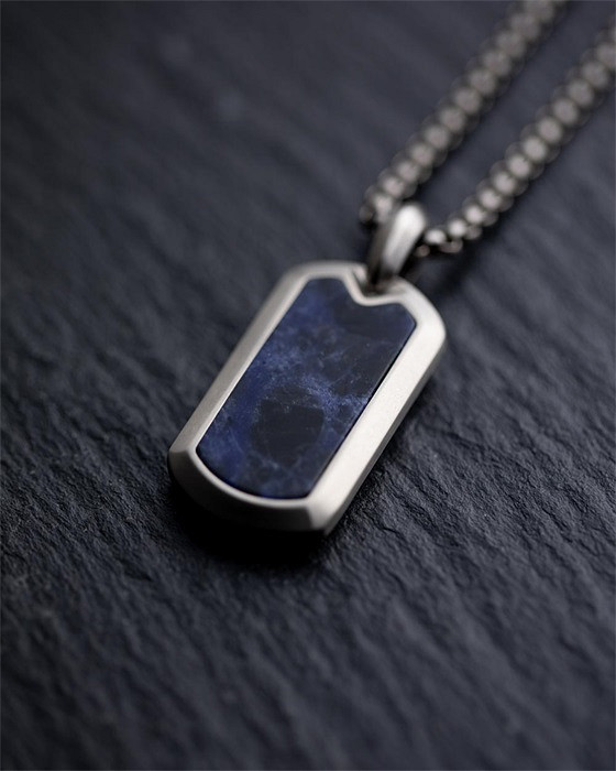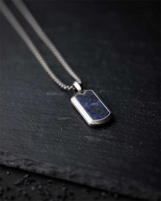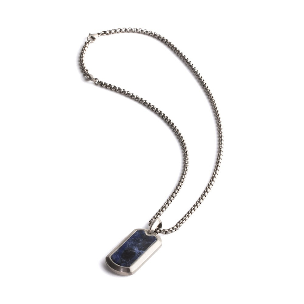 Diese Halskette ist vollständig aus japanischem Titan gefertigt und mit einem blauen Jeremejevit-Naturstein veredelt. Titan ist federleicht, ultrastark und hypoallergen. Dieses Material wird häufig in der Luft- und Raumfahrt oder in Luxusautos verwendet.