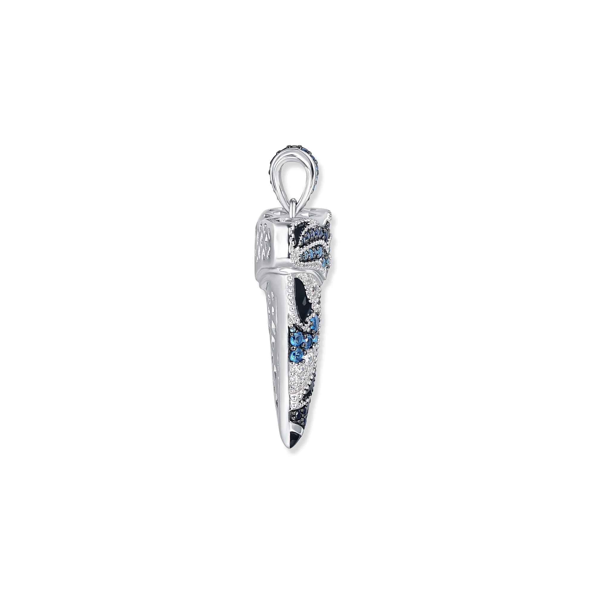 Entdecke den Mako Haizahn Anhänger, ein herausragendes Schmuckstück aus rhodiniertem Sterling Silber, verziert mit Zirkonia in Schwarz, Weiß und Blau sowie schwarzer Emaille. Der Anhänger zeigt ein kunstvolles maritimes Muster, das die faszinierende Unterwasserwelt in einem modernen Design widerspiegelt. Die Kombination aus edlen Zirkonia-Steinen und der tiefschwarzen Emaille betont die feinen Details des Haizahns und verleiht dem Anhänger eine raffinierte Ausstrahlung. Dieser Anhänger ist Teil der exklusiven Wasserwelten-Kollektion von SEINERZEIT und fügt sich nahtlos zu weiteren Produkten wie Harold und Raymond ein. Das hochwertige Sterling Silber gewährleistet Langlebigkeit und beständige Qualität, wodurch der Mako Haizahn Anhänger zu einer wertvollen Ergänzung deiner Schmuckkollektion wird.
