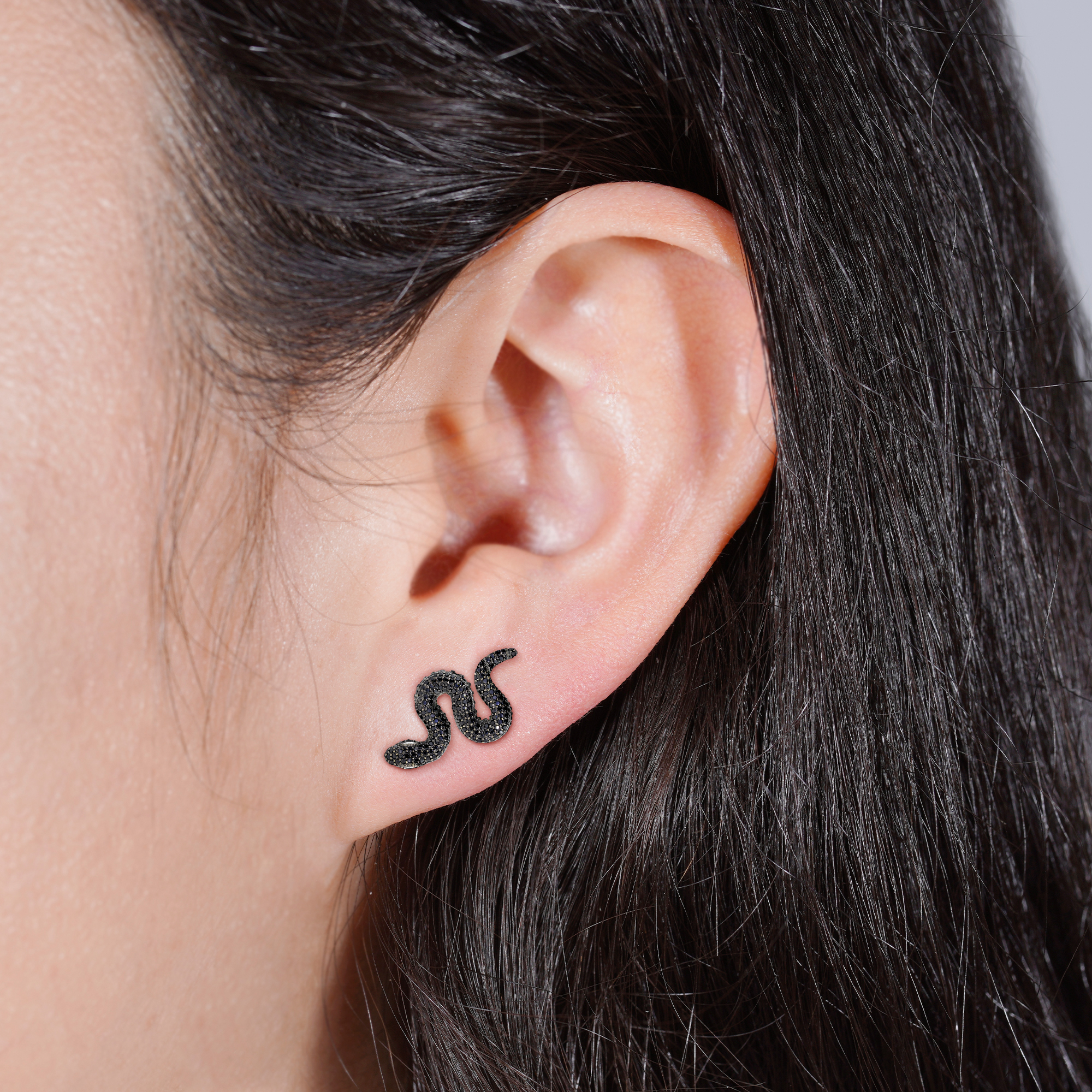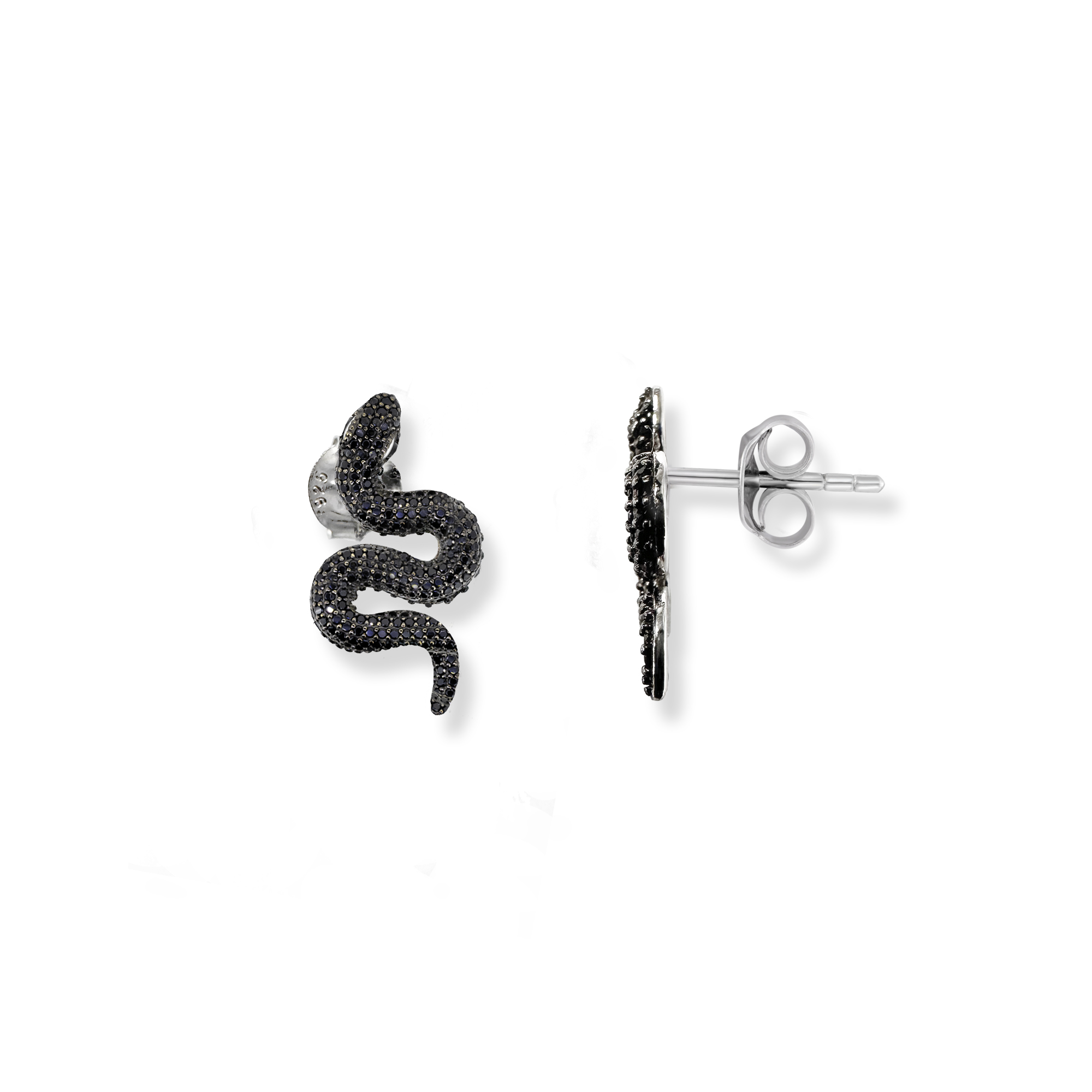 Ergänze deine Schmuckkollektion mit den dezenten Mambo Schlangen Ohrsteckern, die perfekt zum passenden Statement-Anhänger harmonieren. Diese eleganten Ohrstecker sind aus hochwertigem 925 Sterling Silber gefertigt und rhodiniert, um zusätzlichen Schutz und Glanz zu gewährleisten. Die geschwärzte Oberfläche bringt die faszinierenden Details der Schlangenform besonders zur Geltung und verleiht dem Design eine geheimnisvolle Note. Mit funkelnden, einfarbigen schwarzen Zirkonia-Steinen besetzt, fangen sie das Licht dezent ein und setzen sanfte Akzente, die jedem Look eine subtile Eleganz verleihen. Diese Ohrstecker sind ideal für alle, die ein stilvolles, minimalistisches Accessoire suchen, das dennoch eine starke Aussage trifft. Sie sind leicht und angenehm zu tragen und eignen sich hervorragend für den Alltag oder besondere Anlässe, an denen du mit einem Hauch von Raffinesse glänzen möchtest. Die Mambo Schlangen Ohrstecker sind die perfekte Wahl für einen modernen, individuellen Stil, der sich durch Qualität und zeitlose Schönheit auszeichnet.