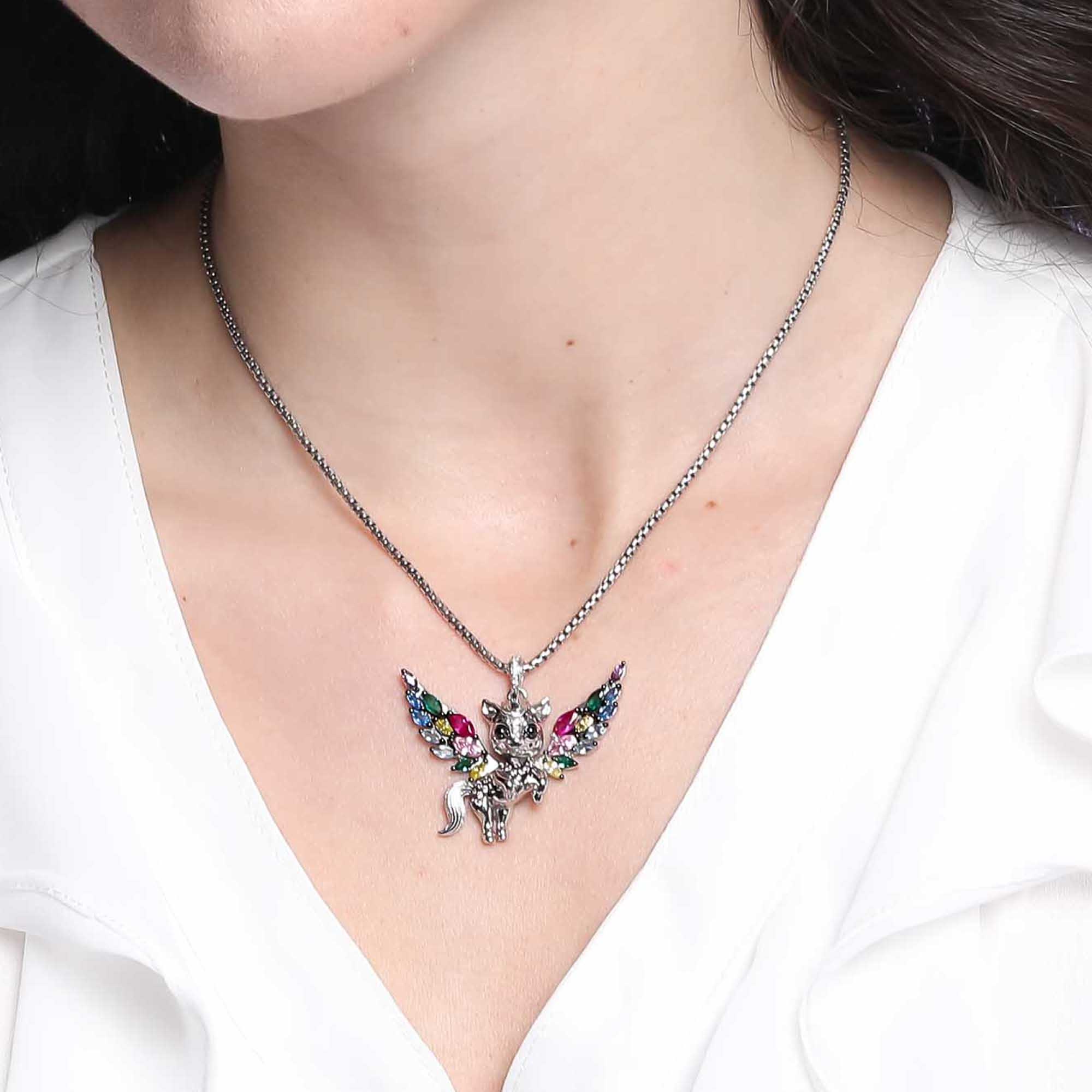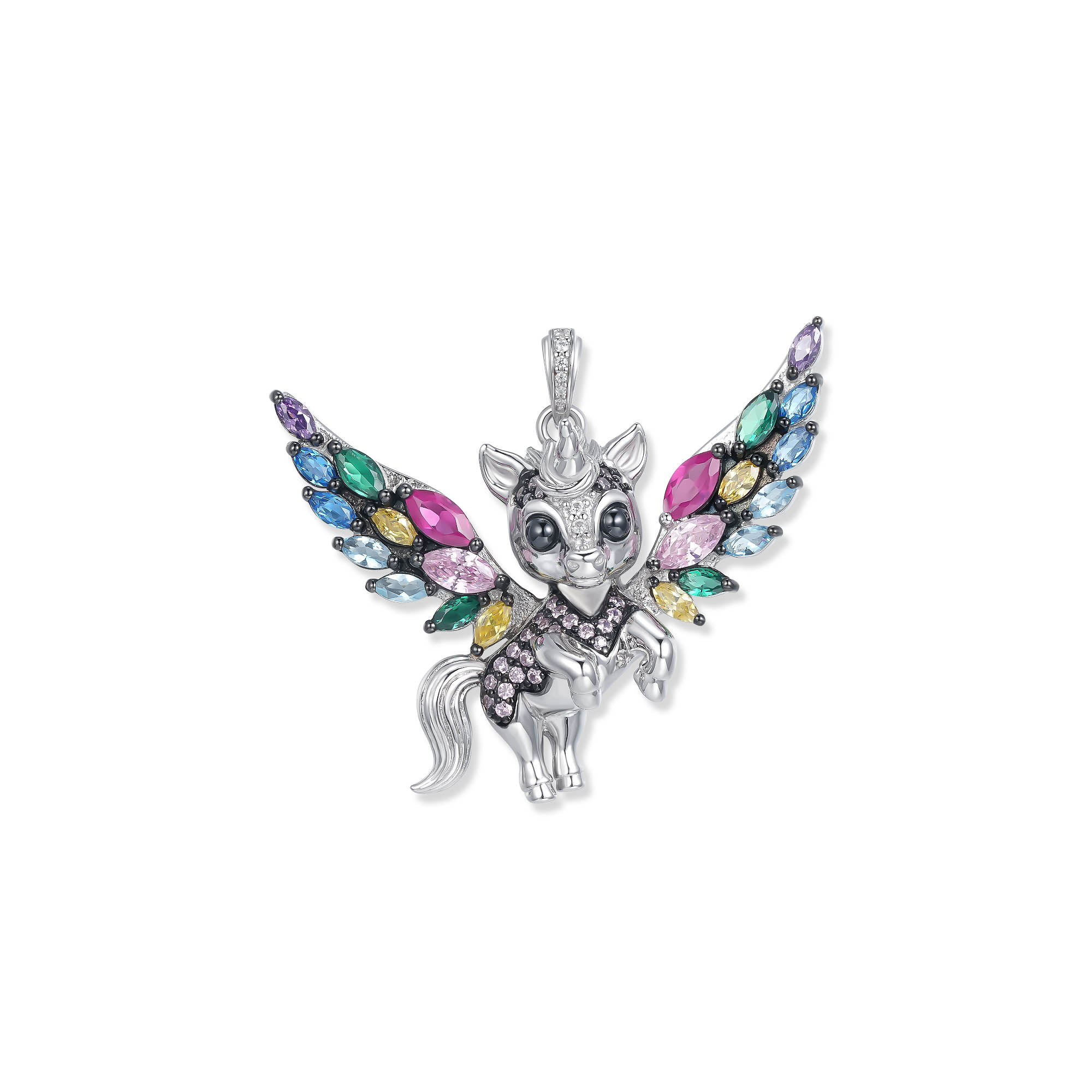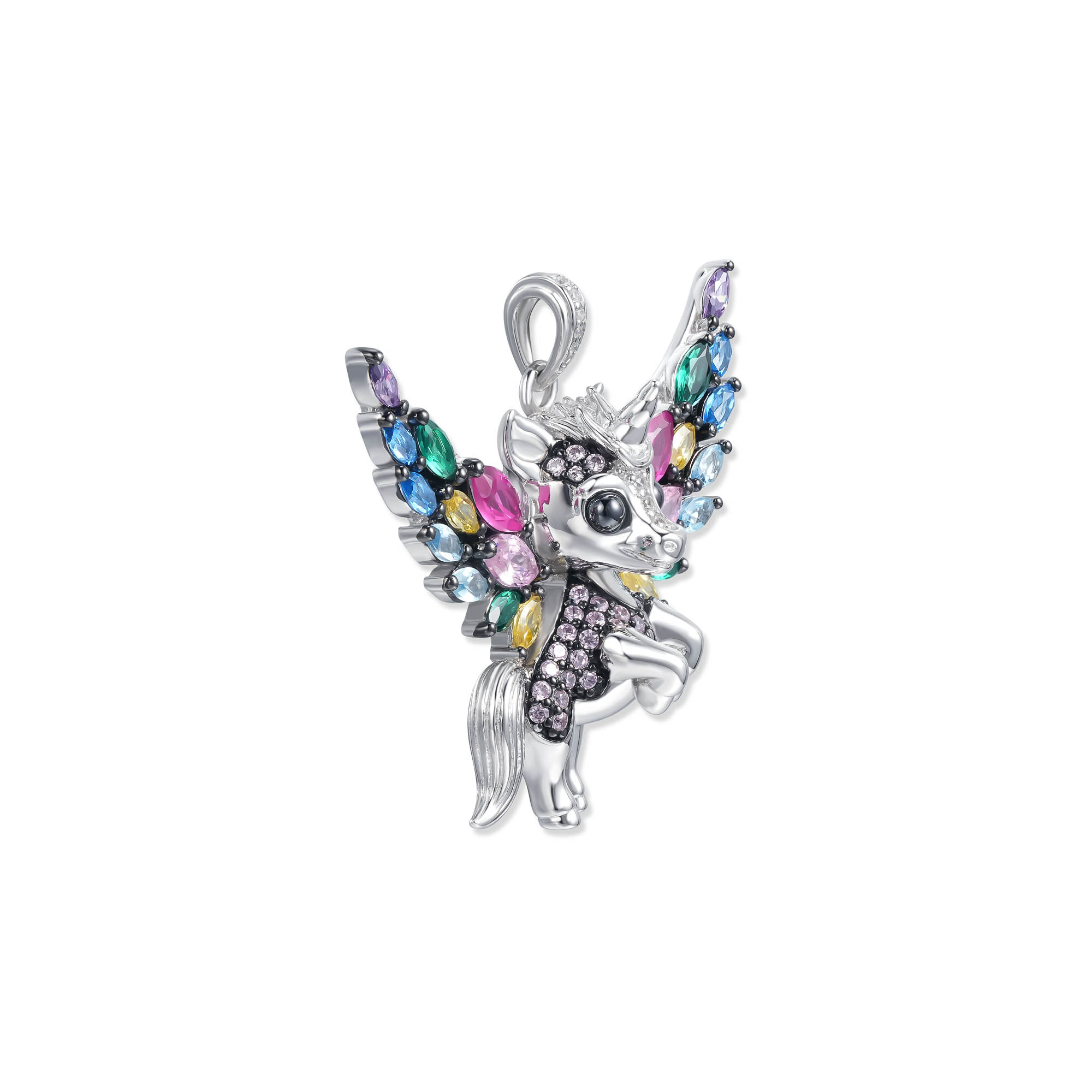 Der Melody Einhorn Anhänger aus der SEINERZEIT Dream Kollektion ist ein fantasievolles Schmuckstück, das die Magie und den Charme eines Baby-Einhorns in einem detailreichen und plastischen Design einfängt. Gefertigt aus 925er Sterling Silber, stellt der Anhänger ein bezauberndes Einhorn mit Flügeln dar, das durch seine filigrane Gestaltung und hochwertigen Materialien besticht. Die Flügel sind mit funkelnden Zirkonia in lebendigen Farben wie Rosa, Blau und Grün verziert, die dem Anhänger eine verspielte und leuchtende Ausstrahlung verleihen. Die plastische Darstellung und die liebevoll gearbeiteten Details, von der Mähne bis zu den Flügelspitzen, machen dieses Schmuckstück zu einem echten Blickfang. Der Melody Einhorn Anhänger ist perfekt für Liebhaber von Fantasy und märchenhaften Designs und eignet sich sowohl als persönliches Accessoire als auch als außergewöhnliches Geschenk. Die Kombination aus hochwertiger Verarbeitung, langlebigem Sterling Silber und schimmernden Zirkonia macht den Anhänger zu einem besonderen Highlight für jeden Anlass. Teil der Dream Kollektion, vereint der Melody Einhorn Anhänger Eleganz, Magie und Träumerei in einem einzigartigen Schmuckstück.