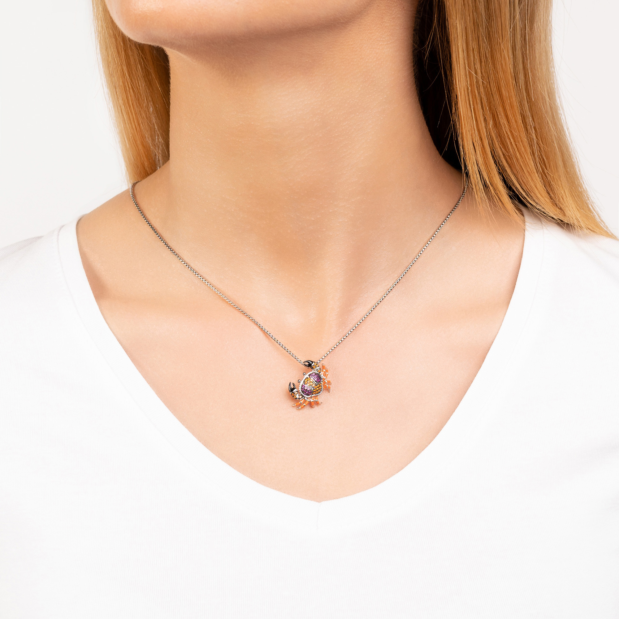 Der Mochi Krebs Anhänger ist eine faszinierende Interpretation des Meereslebens, die in Silber gefasst wurde. Hochwertiges 925 Sterling Silber bildet die Grundlage dieses Schmuckstücks. Durch die Kombination von geschwärztem, rhodiniertem Silber und lebhafter Emaille entsteht ein fesselndes Design. Der Krebs wird in einer präzisen Form dargestellt, die seine charakteristische Gestalt betont. Die Emaille in Schwarz und Orange verleiht dem Anhänger leuchtende Farben und ein lebendiges Erscheinungsbild, das an die Tiefe des Meeres erinnert. Die mehrfarbigen Zirkonia Steine funkeln wie glitzernde Wassertropfen, die im Sonnenlicht tanzen.