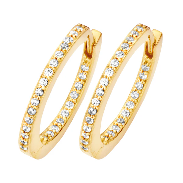 Diese Ohrringe aus der Passion-Serie sind in vergoldetem Sterling Silber mit einer polierten Oberfläche hergestellt und in zwei Größen erhältlich, wobei dies die größte mit einem Durchmesser von 2,5 cm ist. Die Creolen sind in einem klassischen Design mit kantigen Seiten und verziert mit weißen Zirkonia auf Vorder- und Rückseite, was einen einzigartigen Ausdruck schafft.
