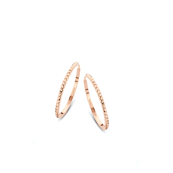 Peak Creolen in hochpoliertem, rosé vergoldetem Sterlingsilber. Die Oberfläche der Creolen ist mit wellenförmigen Formen gestaltet, was den Creolen einen einzigartigen Ausdruck verleiht. Die Creolen, die einen Durchmesser von 1,8 cm haben, können mit passenden Schmuckstücken aus der Peak-Serie getragen werden.