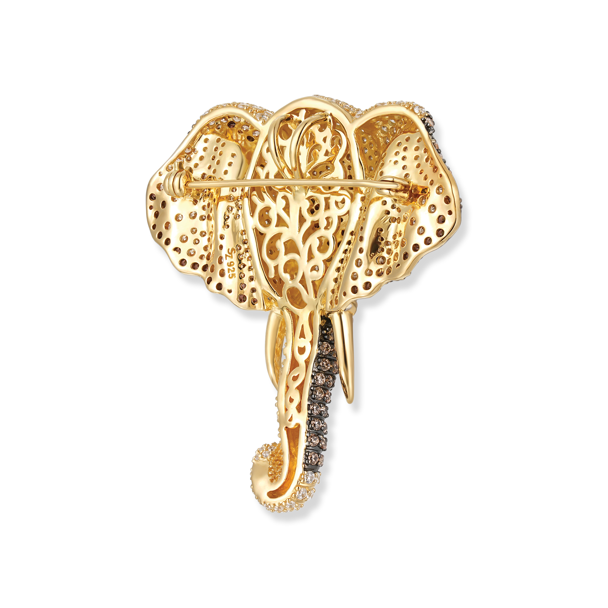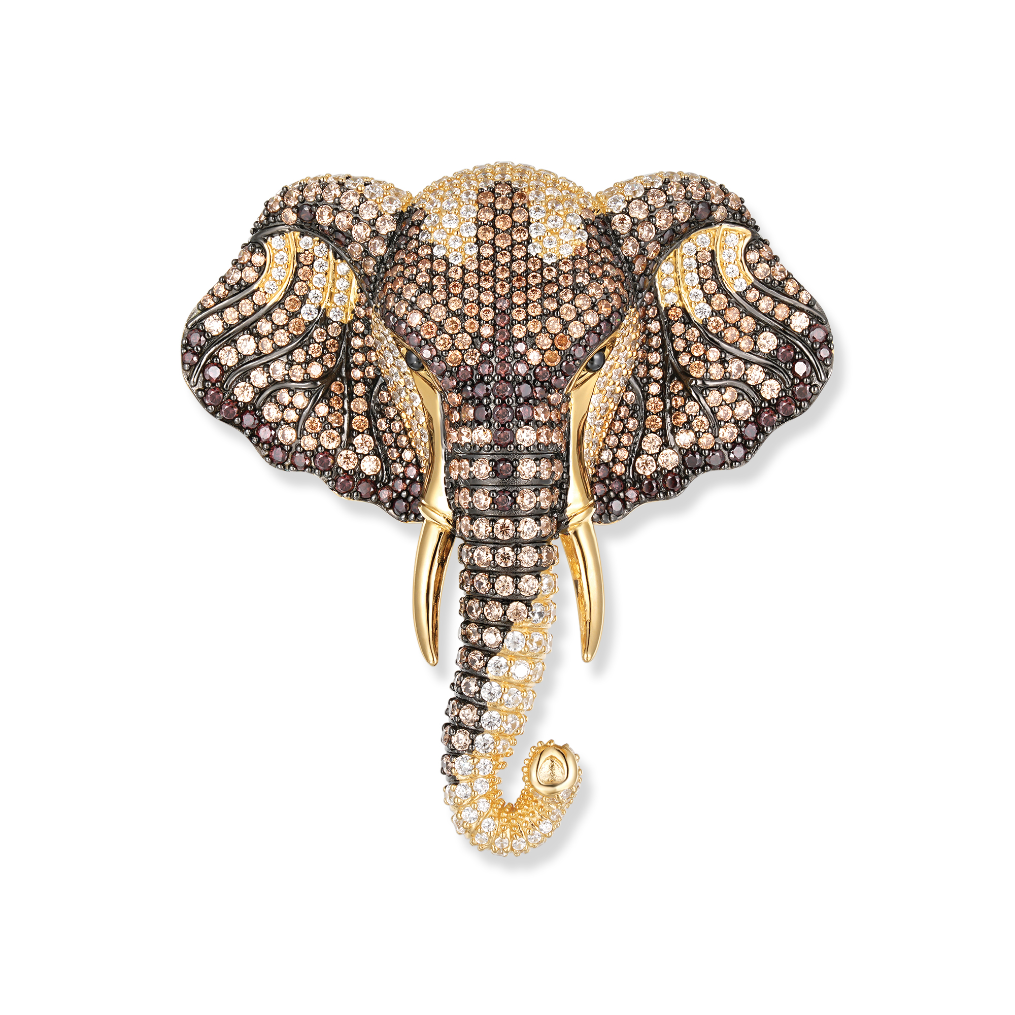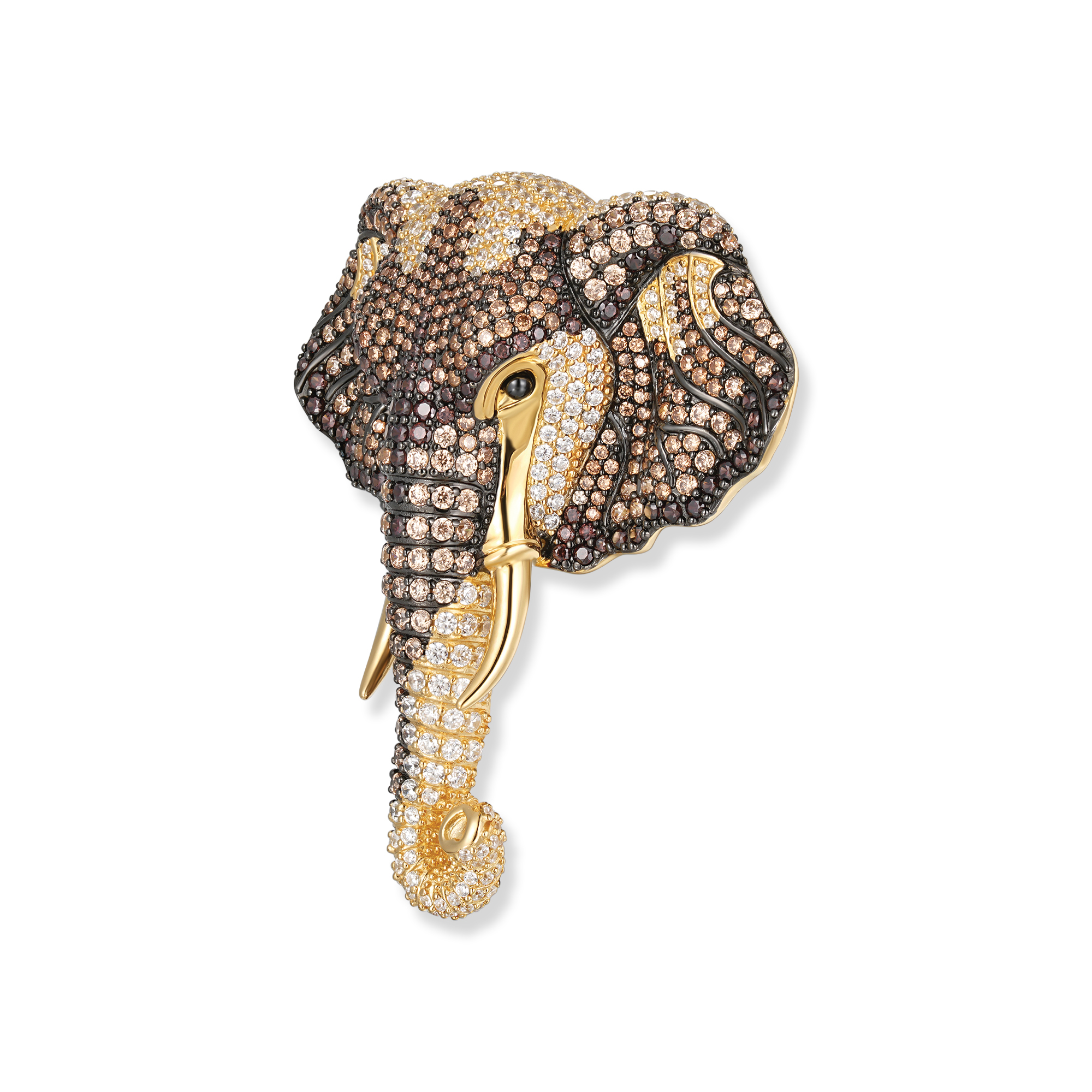 Der Raja Elefanten Anhänger und Brosche ist ein einzigartiges Schmuckstück, das die majestätische Eleganz und die wilde Anmut des Elefanten einfängt. Dieses Meisterwerk wurde aus hochwertigem 925 Sterling Silber gefertigt und kunstvoll mit 18k vergoldet, um ihm eine luxuriöse Ausstrahlung zu verleihen. Der imposante Elefantenkopf, der als zentrales Element des Anhängers und der Brosche dient, hat seinen Rüssel nach oben gebogen, um das Glück einzufangen. Dieses Detail symbolisiert nicht nur Glück, sondern auch Stärke und Erhabenheit, typisch für die majestätischen Elefanten. Die Fassung des Elefantenkopfes ist kunstvoll mit bräunlichen und champagnerfarbenen Zirkonia verziert. Diese funkelnden Steine fügen dem Schmuckstück eine luxuriöse und ausdrucksstarke Note hinzu, die den Charakter des Elefantenkopfes auf elegante Weise unterstreicht. Der Raja Elefanten Anhänger und Brosche ist nicht nur ein Schmuckstück, sondern ein kraftvolles Statement unserer Safari Kollektion. Tragen Sie dieses einzigartige Stück, um Ihre Liebe zur Natur und Ihre Verbundenheit mit der wilden Schönheit der Tierwelt zu zeigen. Es ist der perfekte Begleiter für besondere Anlässe, der Ihren Stil mit einer Note von Eleganz und Abenteuer bereichert.
