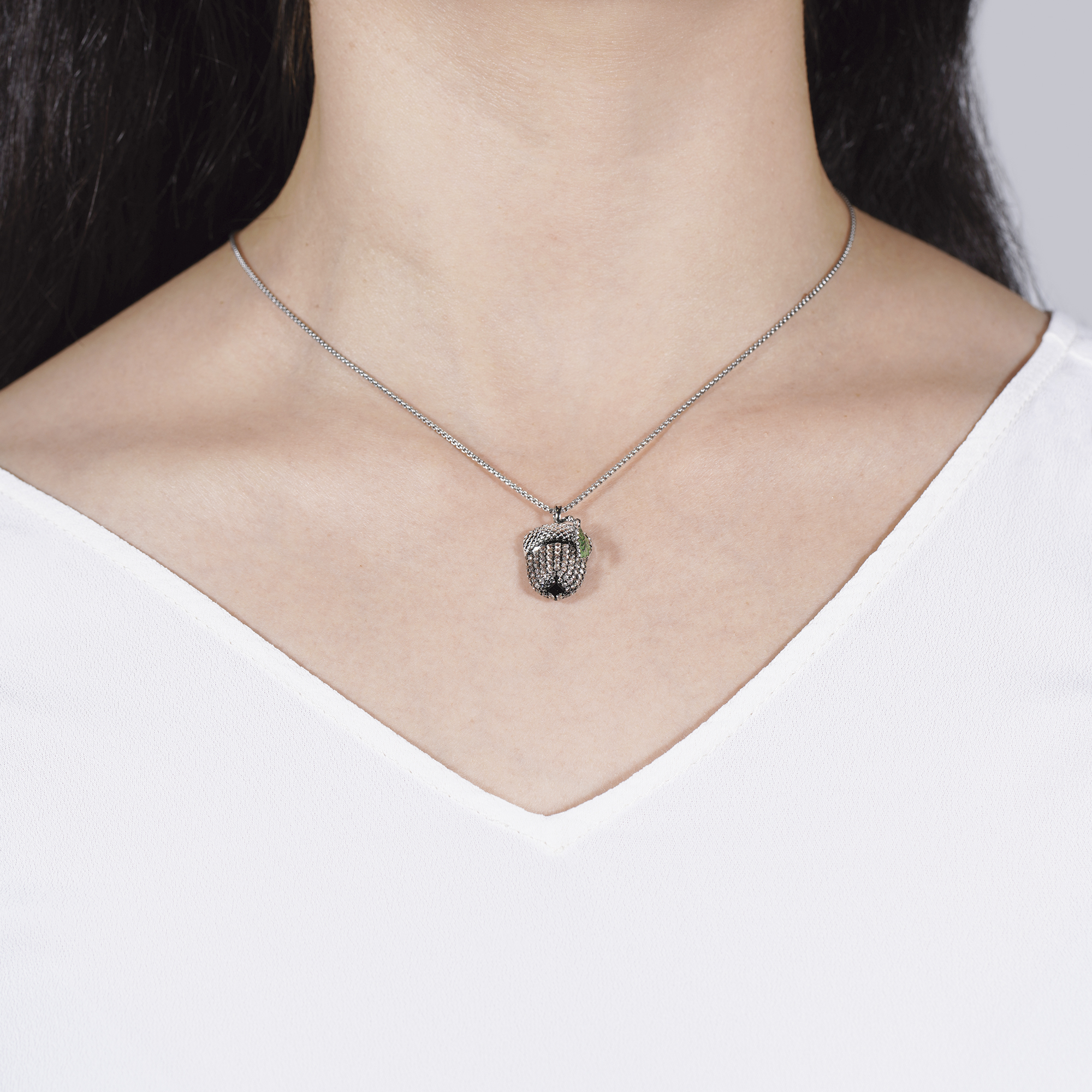 Der Sam Eichelnuss Anhänger ist ein atemberaubendes Schmuckstück aus hochwertigem 925 Sterling Silber, das mit einer rhodinierten Beschichtung versehen ist, um einen langanhaltenden Glanz zu gewährleisten. Der Anhänger ist mit funkelnden braunen Zirkonia Steinen verziert, die ihm ein elegantes und luxuriöses Aussehen verleihen. Das lieblich hängende grün emaillierte Blatt fügt dem Design eine natürliche und charmante Note hinzu. Mit seiner einzigartigen Kombination aus Farben und Formen ist dieser Anhänger ein echter Blickfang. Tragen Sie ihn an einer Kette und verleihen Sie Ihrem Outfit einen Hauch von Eleganz und Stil. Er eignet sich auch hervorragend als Geschenk für besondere Anlässe oder als persönliches Schmuckstück, das Ihre Persönlichkeit und Ihren individuellen Stil zum Ausdruck bringt.