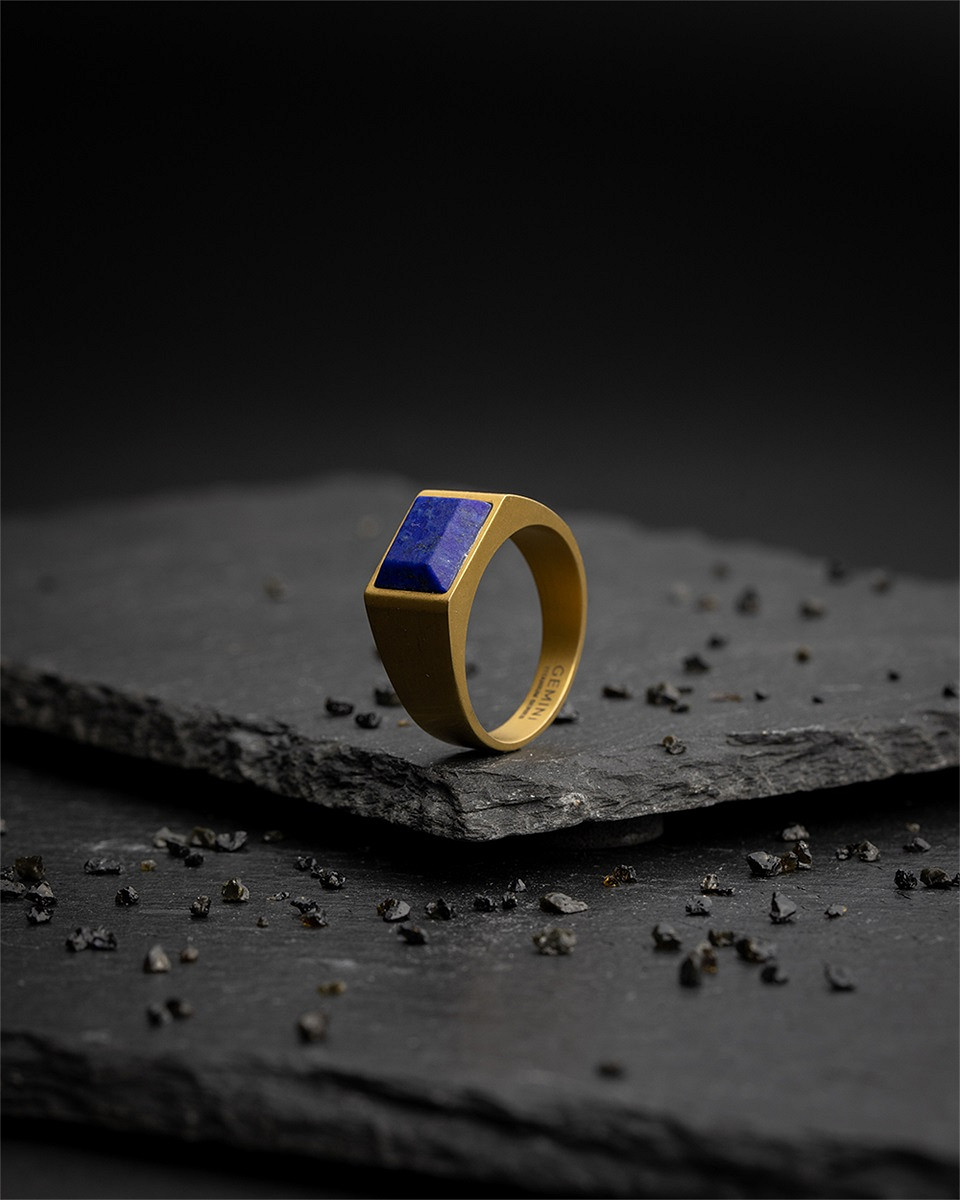 Der Credo Gold Blue Ring besteht aus Titan und ist mit einem individuellen blauen Lapislazuli-Stein veredelt. Dieser Naturstein wird auch als Stein der Weisheit bezeichnet und kommt hauptsächlich in Afghanistan vor. Es macht den Kopf klarer, hat einen positiven Einfluss auf die Gemütslage und regt die Bindung zu anderen Menschen an.