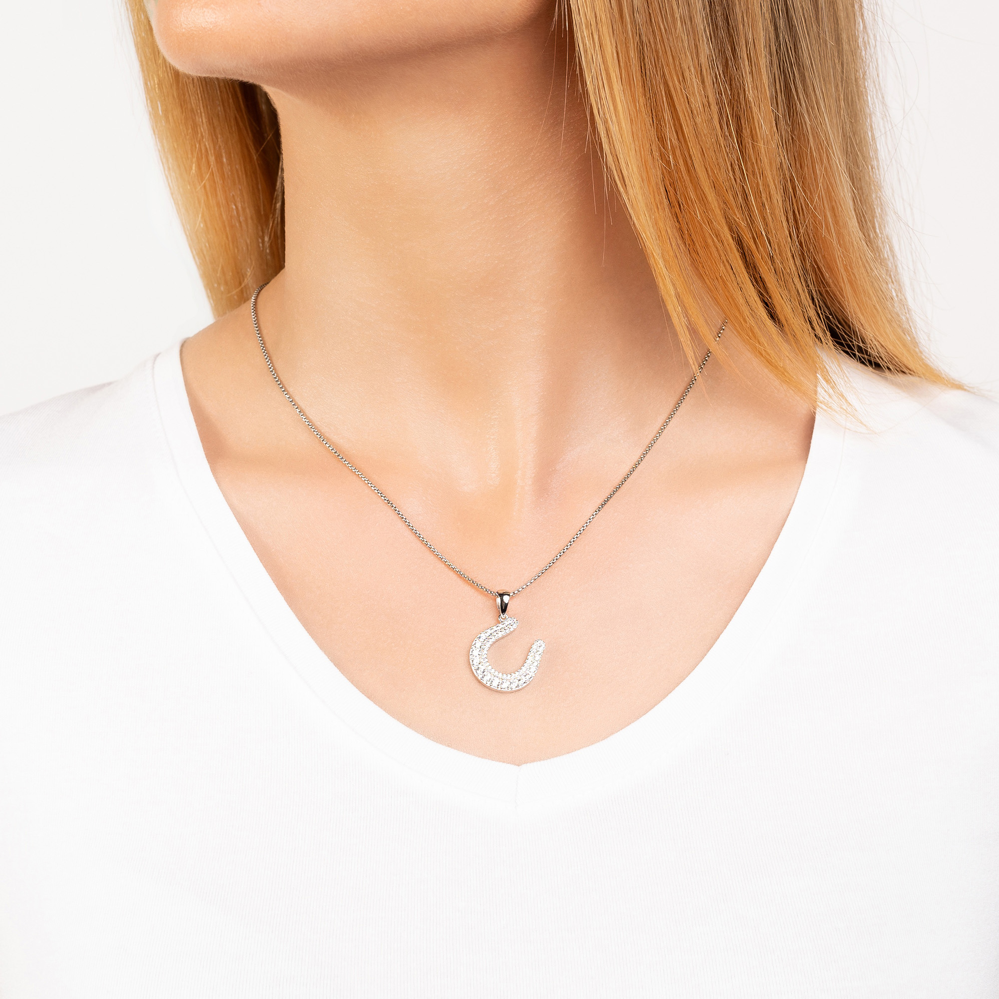 Der Sole Hufeisen Anhänger ist eine zeitlose Darstellung von Glück und Stil. Hergestellt aus hochwertigem 925 Sterling Silber und rhodiniert für anhaltenden Glanz, ist dieser Anhänger mit funkelnden weißen Zirkonia Steinen besetzt, die seine Schönheit und Eleganz unterstreichen. Das Hufeisen als Symbol des Glücks wird hier in einer modernen und raffinierten Weise präsentiert. Die klaren weißen Zirkonia Steine fangen das Licht ein und sorgen für ein atemberaubendes Funkeln. Das Design des Anhängers vereint Tradition und Moderne, wodurch er zu einem vielseitigen Schmuckstück wird, das zu unterschiedlichsten Outfits und Anlässen passt.