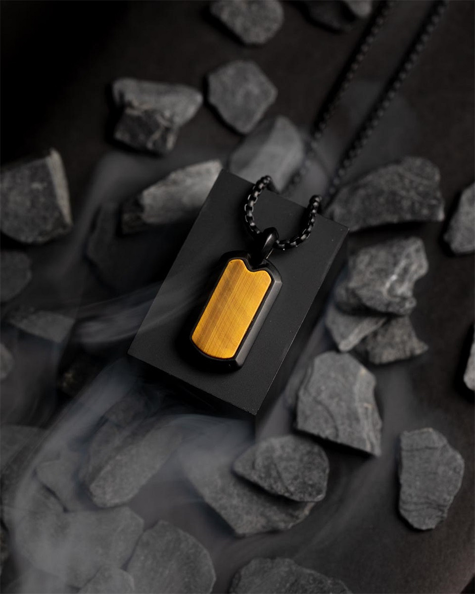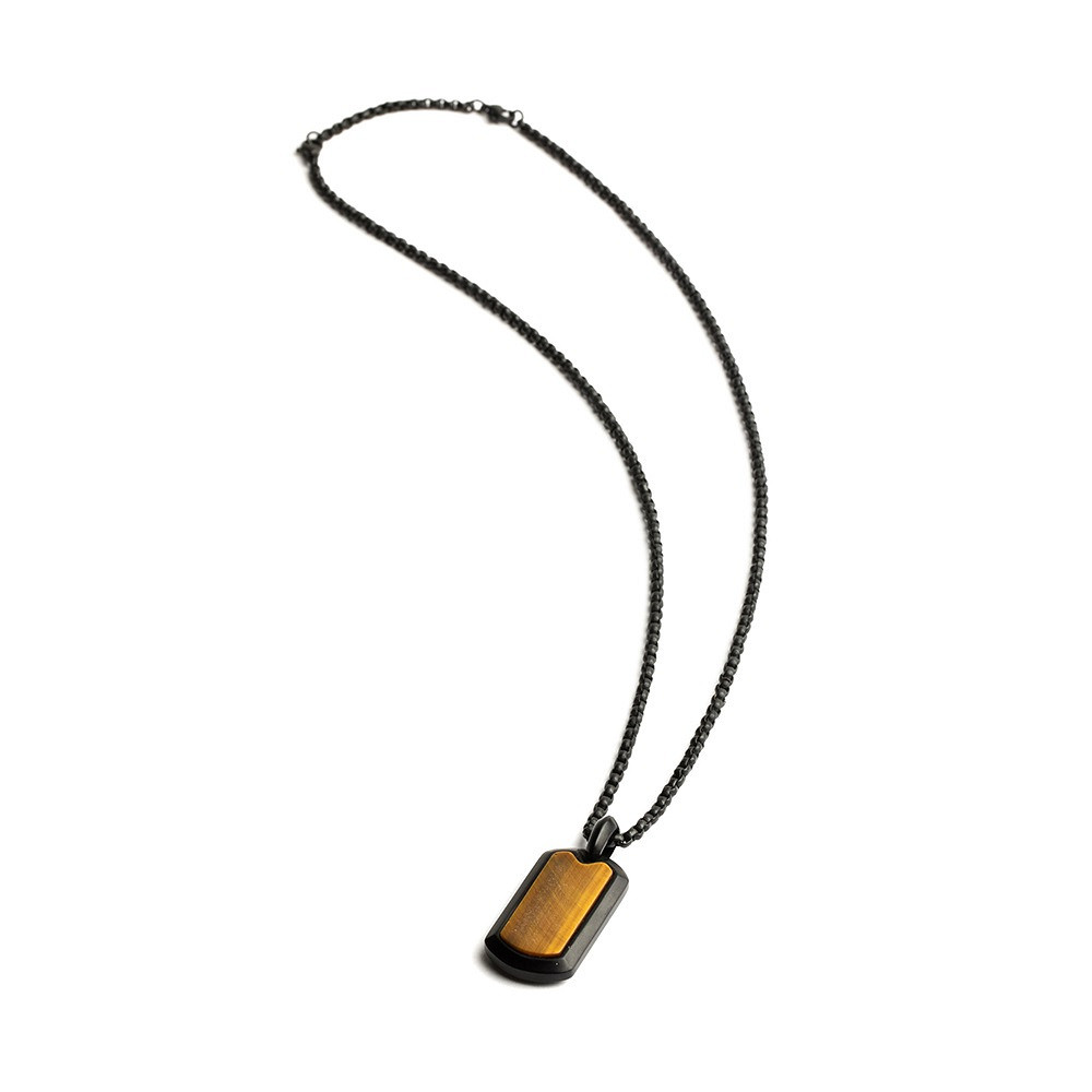Diese Halskette ist vollständig aus japanischem Titan gefertigt und mit einer schwarzen Beschichtung und einem Tigerauge-Stein veredelt. Titan ist federleicht, ultrastark und hypoallergen. Dieses Material wird häufig in der Luft- und Raumfahrt oder in Luxusautos verwendet.