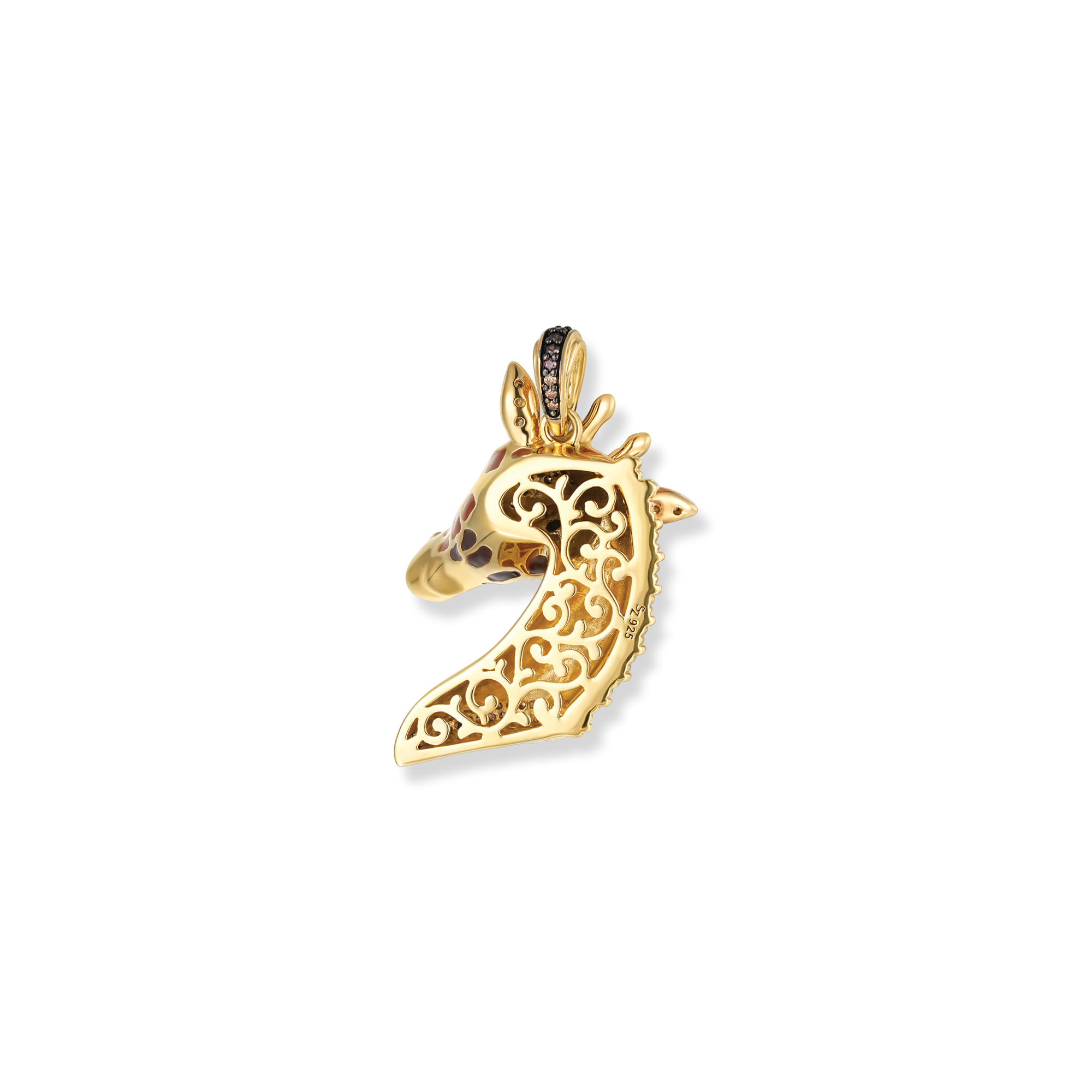 Der Zuri Giraffen Anhänger ist mehr als nur ein Schmuckstück – er ist eine kunstvolle Darstellung von Anmut und Eleganz. Gefertigt aus hochwertigem 925 Sterling Silber und kunstvoll mit 18 K vergoldet, strahlt dieser Anhänger einen warmen und luxuriösen Glanz aus. Der Giraffenkopf, als zentrales Element des Anhängers, wird durch eine bräunliche Emaille präsentiert, die das einzigartige Muster des Giraffenfells kunstvoll nachahmt. Jedes Detail wurde mit höchster Präzision gestaltet, um die charakteristische Eleganz und Grazie der Giraffe einzufangen. Die Zirkonia, kunstvoll gefasst und verziert, fügen dem Anhänger einen Hauch von Funkeln und Glamour hinzu. Dieses herausragende Design verleiht dem Zuri Giraffen Anhänger eine zeitlose Ästhetik und macht ihn zu einem auffälligen Accessoire für besondere Anlässe oder den täglichen Gebrauch. Tragen Sie diesen Anhänger, um Ihre Liebe zur Natur und Ihre Affinität zur exquisiten Ästhetik zu zeigen. Der Zuri Giraffen Anhänger ist nicht nur ein Schmuckstück, sondern ein Statement von Anmut und Eleganz, das Ihren persönlichen Stil auf einzigartige Weise unterstreicht.